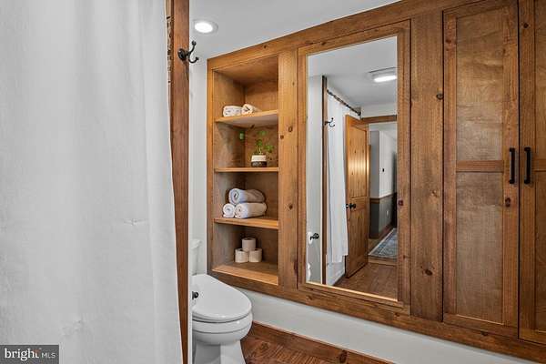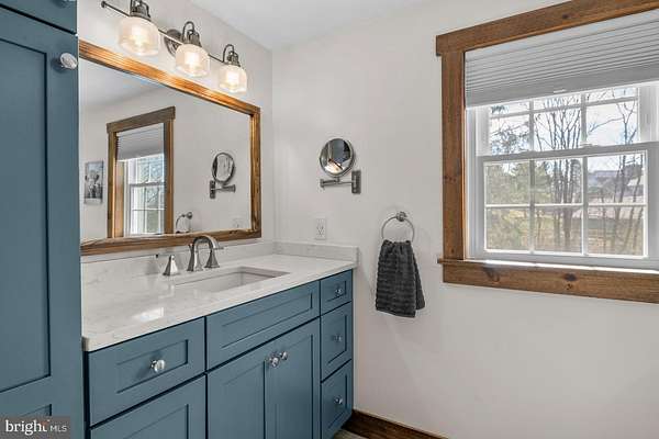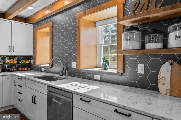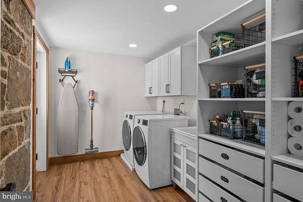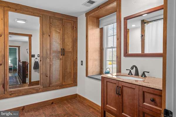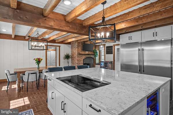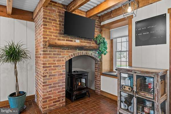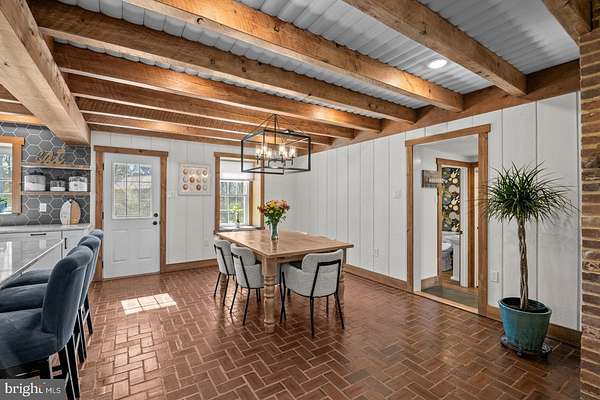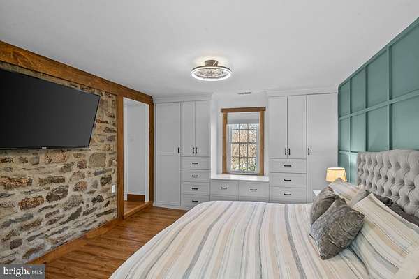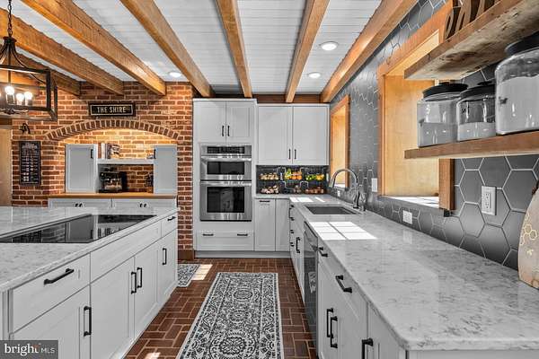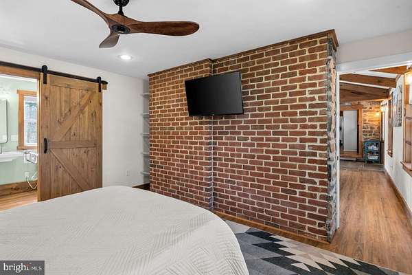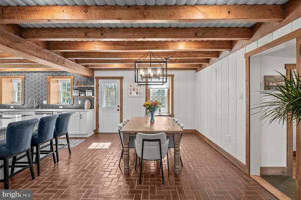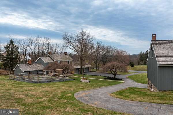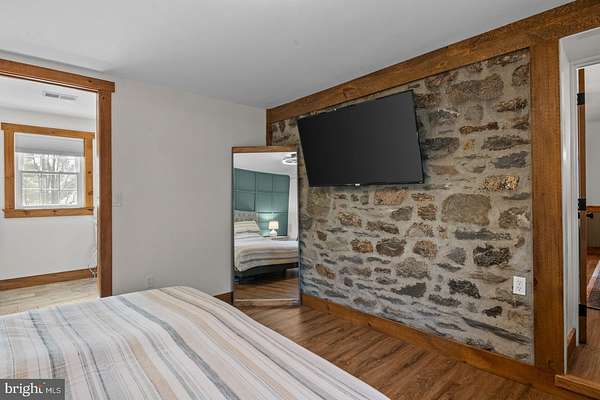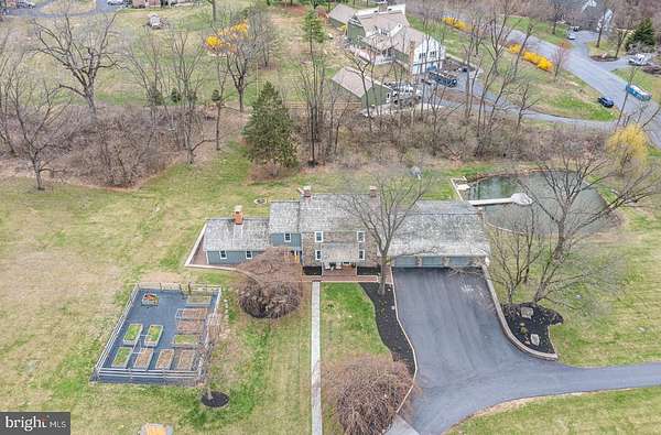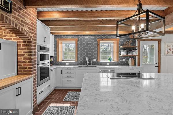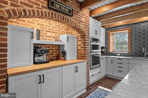 Experience refined country living in this stunning 2-story stone and wood-sided home, offering over 3,800 square feet of beautifully updated living space on 2.25 acres in the highly sought-after Plum Creek Estates. From the moment you arrive, the charming covered brick front porch welcomes you into an impressive foyer. Inside, the spacious living room showcases soaring cathedral ceilings with exposed beams, a striking stone accent wall with pellet stove, and a sun-filled bay window that creates a warm and inviting atmosphere. The heart of the home is the chef's kitchen, thoughtfully designed with quartz countertops, an oversized island with seating, a cooktop with downdraft, beverage fridge, and an eye-catching tile backsplash with open shelving. Architectural details abound, including a stunning brick arched wall with a built-in coffee bar and additional storage, brick flooring, deep window sills, and a second pellet stove-blending charm with modern functionality. Instant hot water adds everyday convenience. The main level also features a spacious dining area with outdoor access-perfect for entertaining-as well as a luxurious primary ensuite complete with a barn door entry, spa-like bathroom, tiled walk-in shower, and freestanding soaking tub. A well-equipped laundry room with ample storage and a powder room complete this floor. An additional versatile room currently used as a gym offers flexibility as a home office, playroom, or potential fifth bedroom. Upstairs, a second primary ensuite features custom board and batten detailing, built-in cabinetry, and a beautifully tiled shower. Two additional bedrooms and a full hall bath with storage provide plenty of space for family or guests. Step outside to enjoy the expansive property, complete with a 3-car attached garage, a large bank barn with an additional 2-car garage and a mechanic's pit, a picturesque pond with fountain, and a spacious Trex deck and brick patio ideal for outdoor living and entertaining. Additional upgrades include luxury vinyl plank flooring throughout most of the home, a security system with cameras, brand new generator, water softener, new windows, and an electric fence. There is a chicken coop, including the chickens and ducks! Enjoy the tranquility of country living while remaining conveniently close to Blue Marsh Recreation Area, major highways, shopping, and dining. This exceptional property offers the perfect blend of elegance, comfort, and functionality-ready to welcome you home. Note: Original farmhouse was built around 1880. Additions to structure were added during the 1980s.