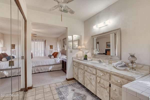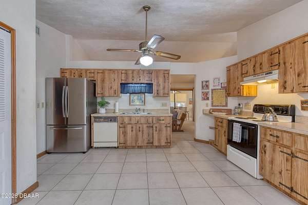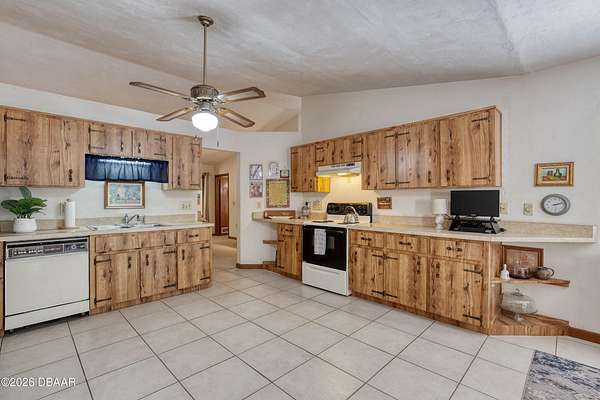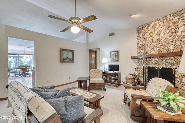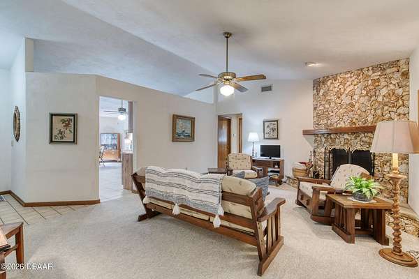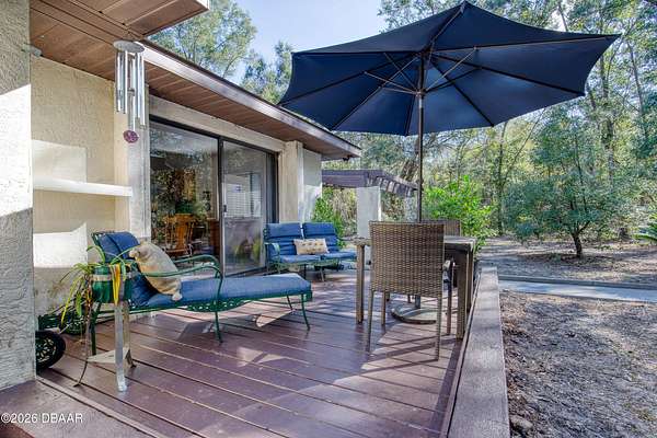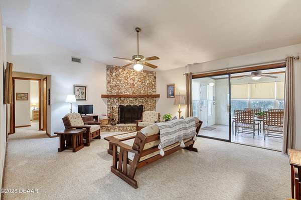 5669 Winona Trail | DeLeon Springs, FL Situated on 2.5 acres, this well-maintained property offers privacy, space, and a functional layout in a quiet DeLeon Springs setting. The home features 2 bedrooms, 2 full bathrooms, a oversized 2-car garage, and an additional carport, with ample room both inside and out. Just past the foyer, you're welcomed into the living room, which features a wood-burning fireplace. The spacious kitchen and dining area provide a practical layout and include a glass sliding door leading out to the front porch, allowing for natural light and easy outdoor access. The home offers a split floor plan, with both bedrooms featuring en-suite bathrooms. The primary suite includes a walk-in closet, dual vanities, a soaking tub, and a separate shower, along with a glass sliding door that opens to the enclosed Florida room. The second bedroom has its own private bathroom with access from both the bedroom and the hallway, making it ideal for guests. The enclosed Florida room provides flexible additional living space with large windows and natural light. Outside, the property includes a pump house located next to the carport, which also serves as a great workshop area. The expansive 2.5-acre lot offers plenty of space for parking, storage, and outdoor use, making this property well suited for those seeking room to spread out in a rural setting.
