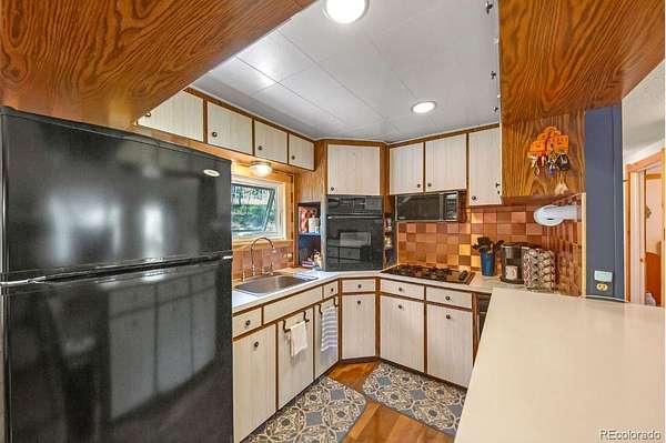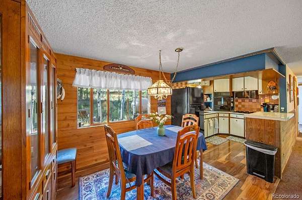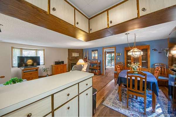 Inside, the home is warm and inviting, with cozy living spaces perfect for relaxing or entertaining. Large windows bring the forest setting indoors, while the open living and dining areas create a welcoming flow. The kitchen retains its mountain-cabin charm and is positioned conveniently next to the dining room.