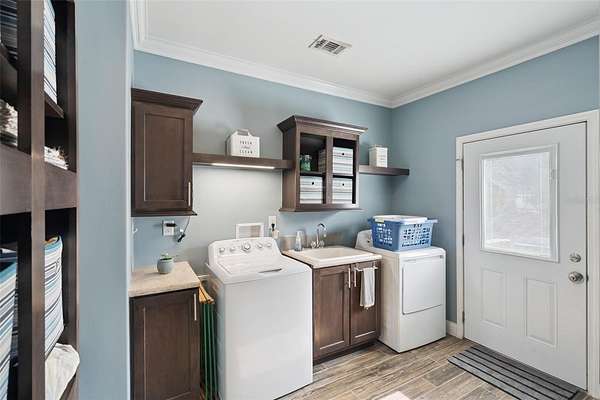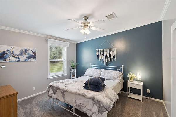 At the center of the home, the kitchen features stone countertops, stainless appliances, a large island with seating, and elegant details like coffered ceilings, crown molding, and oversized picture windows. The primary suite includes a spacious en-suite bath and an attached flex room ideal for a nursery, gym, or home office. A guest bedroom and full bath sit privately at the opposite end of the home. Two additional bedrooms share a third full bath and a central playroom or family room--ideal for kids, guests, or hobbies.