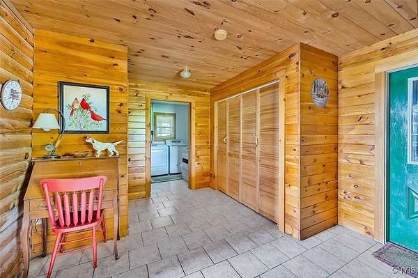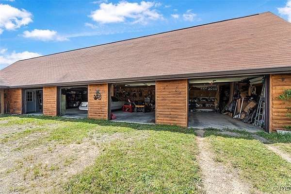 Beautiful log home with a 4 bay garage on 16 acres. Escape to the peace and privacy of country living with this stunning log home perfectly situated on 16 acres and set back from the road to offer breathtaking, unobstructed views of daily sunrises and sunsets. Four bedrooms and three full baths including a spacious first-floor primary suite with hardwood flooring for easy one-level living. Enter through the attached garage into a generous mudroom that includes tile floors, a full bath and laundry area perfect for country life. Both the first floor and the garage feature radiant heat. The heart of the home is a welcoming great room with hardwood floors that flow into an eat-in kitchen, outfitted with ample cabinetry, a large island, and a breakfast bar ideal for entertaining or casual family meals. Upstairs, a rear bedroom with its own balcony provides a quiet retreat with elevated views of the peaceful countryside. The upstairs also includes additional rooms that could be used as bedrooms offering flexible space for guests, a home office, or hobbies. Finished walkout basement offers incredible flexibility with several distinct spaces including a spacious game room, a cozy living area, and two additional rooms that could serve as bedrooms, an office, or hobby spaces. A full bath with a laundry area adds convenience making the space ideal for an in-law suite or guest quarters. Additional features include a hardwired setup for a portable generator, a six-zone heating system, and recently stained decks and home exterior in 2024. Heated four-car garage is sure to impress. After a long day, kick back in the hot tub tucked under the covered porch where you can soak in the peace and quiet of the countryside. Outside, you'll find stamped concrete patios, two fire pits perfect for gathering with friends. The full 360-degree covered deck, with four easy access points, offers the perfect perch to take in sweeping views and savor every sunset. With in-ground pet fencing already in place, your furry friends will feel right at home. This isn't just a house, it's the laid-back, country lifestyle you've been looking for.