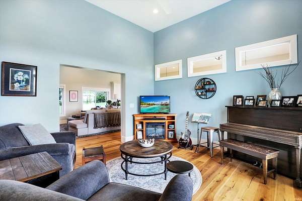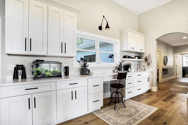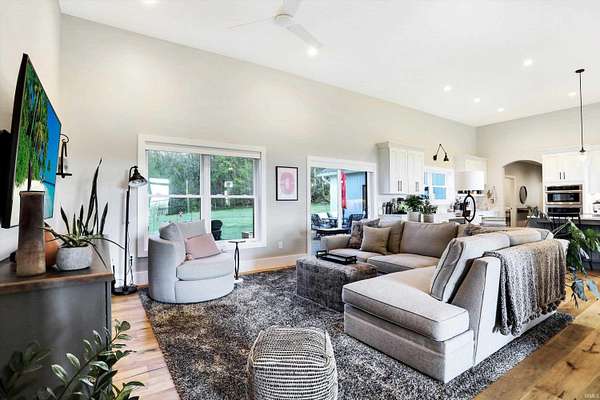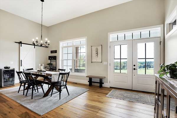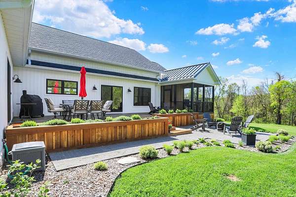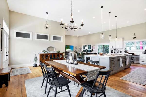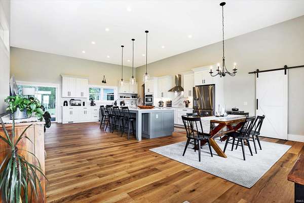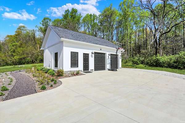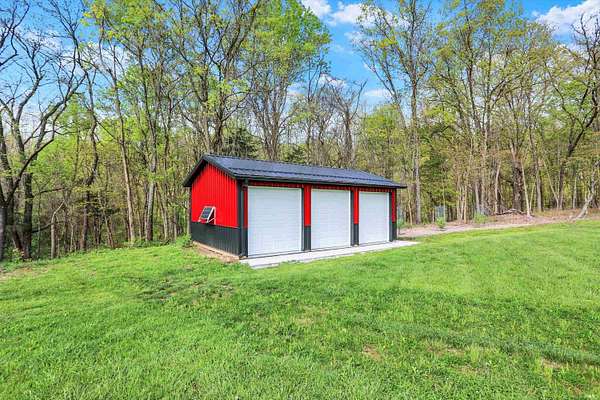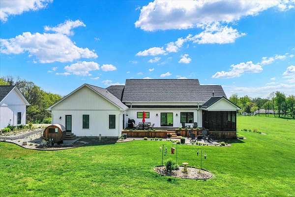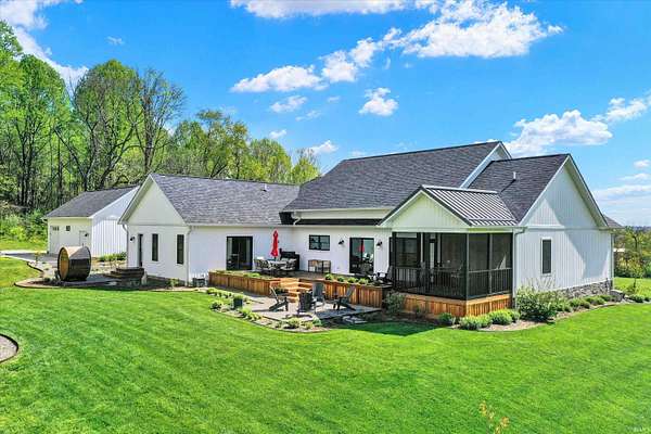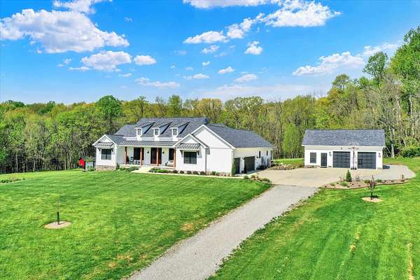 Rare opportunity to own a newly constructed custom ranch home on over 73 acres of pasture and woods and located less than 6 miles from downtown Bloomington, IN. The entrance opens to the large great room with a 12-foot ceiling. The gourmet kitchen includes an induction cooktop, wall oven, and microwave, custom cabinets, quartz countertops, a coffee bar with a sink and instant hot water, and a walk-in pantry. The dining area overlooks the front of the property. The living room area has plenty of space for hosting a large group, with doors that open to an expansive deck and outside screened-in porch. Off the great room is a den/music room. The primary bedroom features doors to the outside deck, a spa-like bath with a deep soaking tub, walk-in shower, heated floors, a heated towel rack, and a door to the outdoor spa. The primary walk-in closet opens to the laundry room. The large mudroom off the garage has built-in storage and a half bath. The other side of the home has two guest bedrooms and a full guest bath. There are engineered wood floors throughout, except for the tiled baths. There are three oversized garage bays are attached to the home, with the third bay being used as an exercise room. The exercise room is insulated and has its own separate mini-split. There is a detached building offering an office with a mini-split and cork flooring, a garden storage room, and additional two-bay storage for cars and/or a workshop. Another outbuilding, which sits away from the home, includes three bays and is powered by solar panels and used for equipment storage. This rolling land is mostly wooded, except for the Northeastern portion where approximately 7 acres of open grass surround the home with miles of private hiking trails. 57.94 Acres are designated as classified forest, which is reflected in the low taxes. The driveway has been recently blacktopped. This unique property is less than 15 minutes to Indiana University and downtown Bloomington. Don't miss this fantastic combination of beautiful land and high level construction!