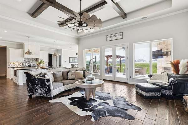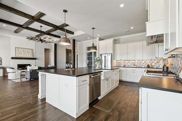 The open-concept layout is flooded with natural light and centered around a chef's dream kitchen featuring an oversized island with breakfast bar and farmhouse sink, a stylish tiled backsplash, stainless steel appliances including a 6-burner gas range with griddle and pot filler, and abundant prep and storage space. The kitchen flows seamlessly into a spacious breakfast area and an inviting living room with a coffered ceiling and floor-to-ceiling stone fireplace.