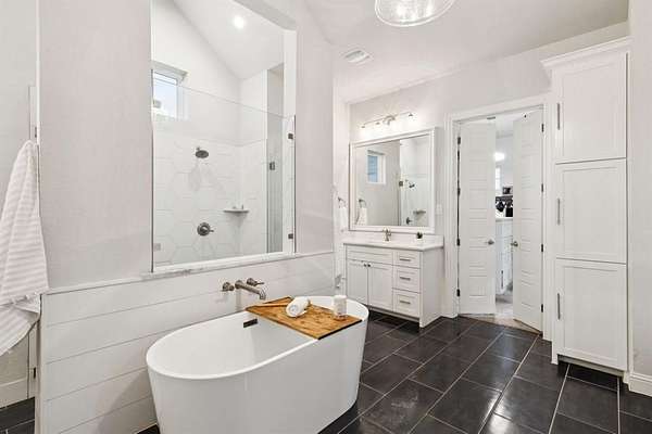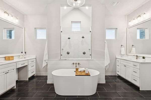 The luxurious primary suite is a true retreat, offering a spa-like ensuite bath with dual-entry walk-in shower, dual shower heads, modern stand-alone soaking tub, dual vanities including a dedicated makeup area, and a massive walk-in closet with an island and direct access to the oversized laundry room complete with built-in cabinetry, a sink, an island, and a linen closet.