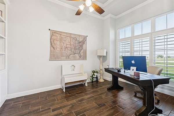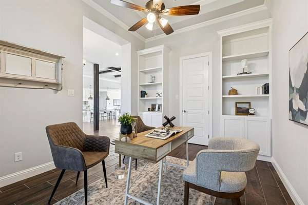 The main floor also features a private office with custom built-ins, an impressive media room with built-in entertainment center and dual closets, and a secondary bedroom with its own ensuite bath. Upstairs, you'll find two additional bedrooms connected by a Jack-and-Jill bath, plus a cozy loft sitting area.
