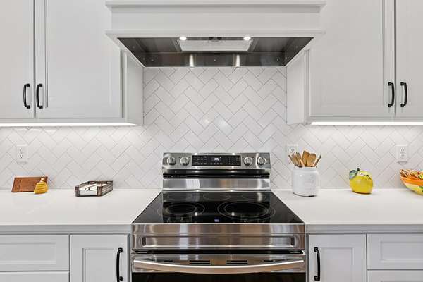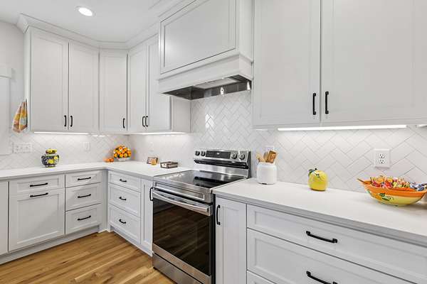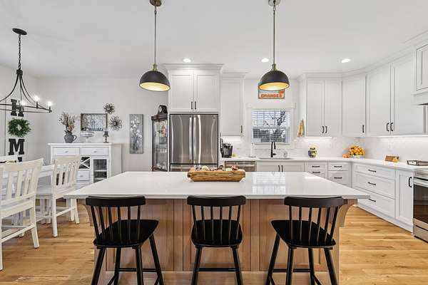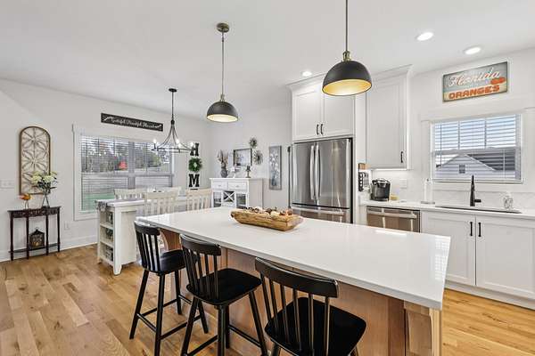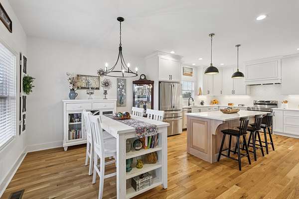 The kitchen shines with quartz countertops, custom soft-close cabinetry, and stainless-steel appliances, while the formal dining area provides the perfect spot for family dinners or special gatherings.