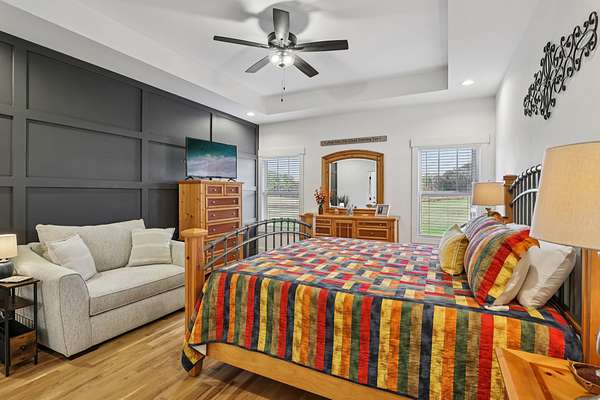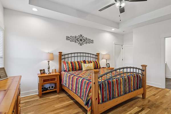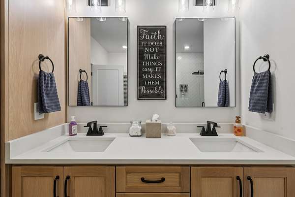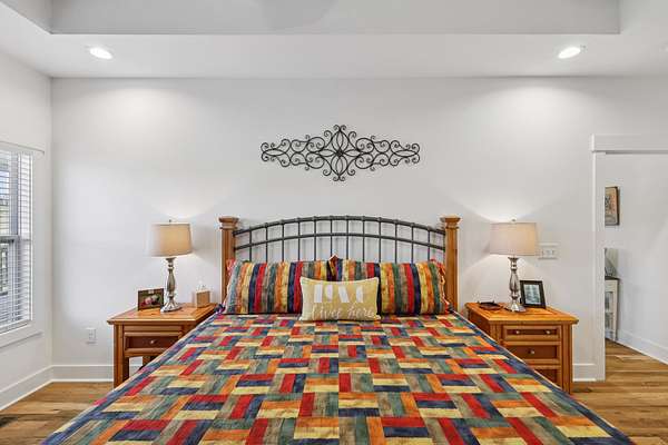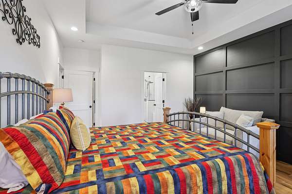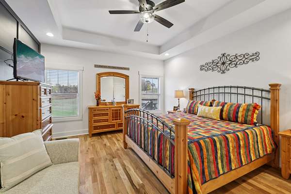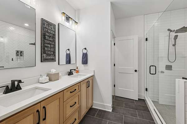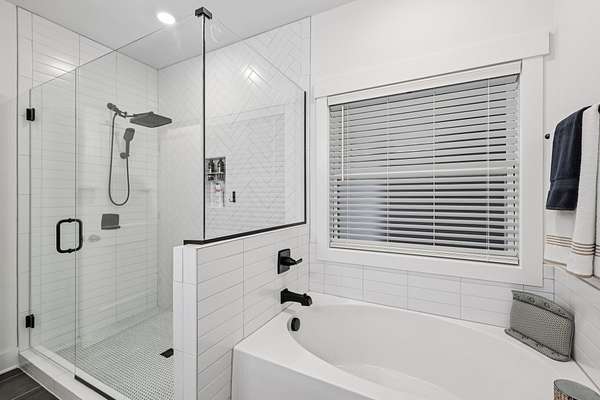The primary suite is a spacious retreat, featuring a walk-in shower and soaking tub for ultimate relaxation, a walk-in closet, and elegant finishes throughout.