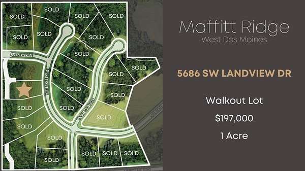 Maffitt Ridge is one of West Des Moines' most environmentally friendly new developments. Only four lots remain in this 38 estate lot development ranging from 0.92-2.90 acres with walkout lots still available. The neighborhood is wooded with an abundance of wildflowers, native prairie grasses, wildlife, and paved walking trail. Located in the West Des Moines School district, this is one of the most private settings in the metro and just minutes away from all the conveniences of West Glen and Jordan Creek Town Center. This development is builder friendly and allows you to choose your own. Panoramic views and adjacent to Maffitt Lake with an 1,500 acre park and reservoir, fishing from public docks and 4.5 miles of hiking trails. Public services including: CITY SEWER, CITY WATER, street maintenance snow and garbage removal!