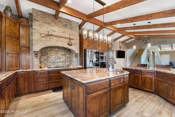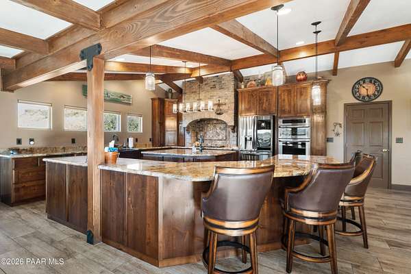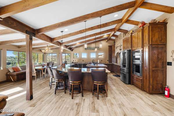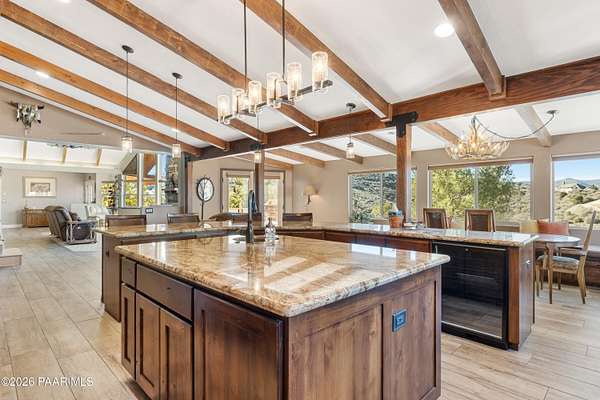 - Beamed Ceilings, Ceiling Fan(s), Counters-Solid SRFC, Eat-In Kitchen, Granite Counters, High Ceilings, Kit/Din Combo, Kitchen Island, Soaking Tub, Walk-In Closet(s), Wash/Dry Connection, Wired For Data