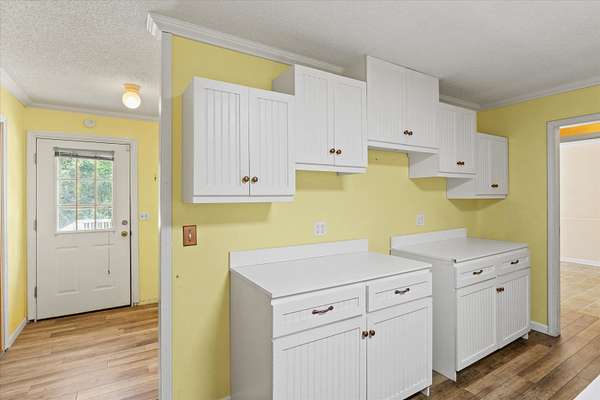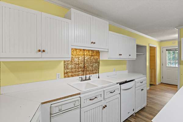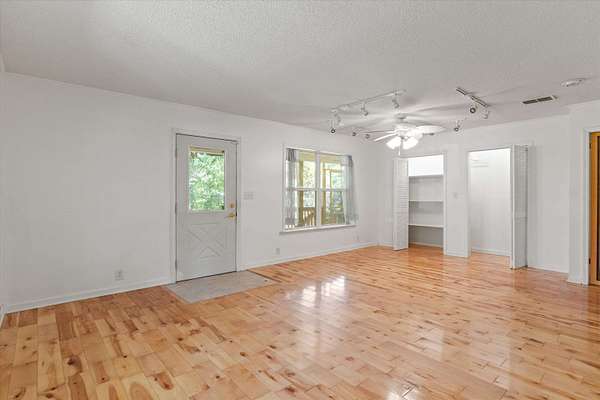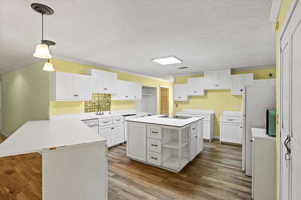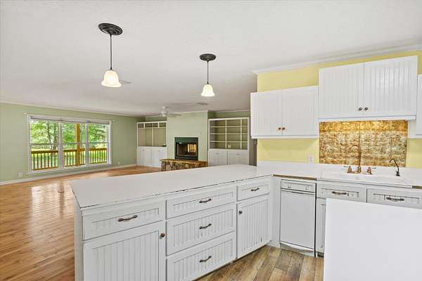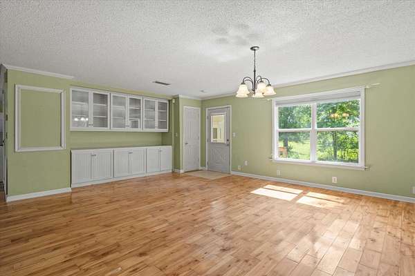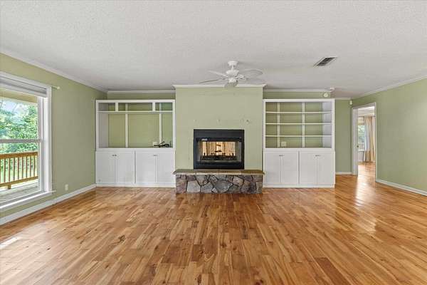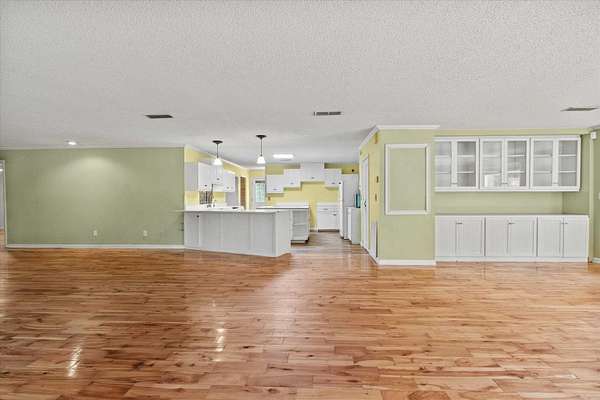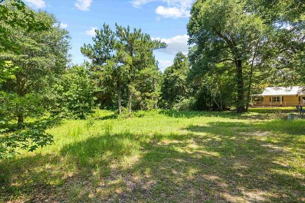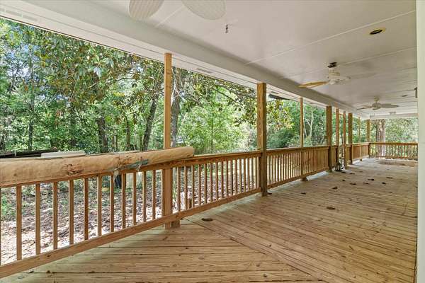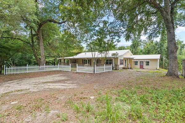 Enjoy over 4 acres of peaceful, private land with a versatile layout designed for comfort and flexibility. This spacious home features a split floor plan with multiple wings-perfect for guests, hobbies, or home offices. A large wraparound porch spans the front and side of the home, offering stunning views of your property. Tucked away for privacy, yet conveniently located just off Highway 90-giving you quick access to wherever you need to go. The home is topped with a durable metal roof and filled with quality finishes, including 3/4" solid birch wood flooring in the living room, dining room, den, and master bedroom. The kitchen, laundry room, hallway, and guest bath feature brand new waterproof flooring by Shaw. Custom solid wood cabinetry adds charm and durability throughout the living, dining, and kitchen areas. A cozy two-sided fireplace connects the living room and den, creating a warm, inviting atmosphere. Additional features include two HVAC zones, two water heaters (one dedicated to the master bath), and a full Culligan water filtration and softening system. Outside, you'll find a 12x16 shed and a 36x24 pole barn-perfect for storage, projects, or outdoor toys.