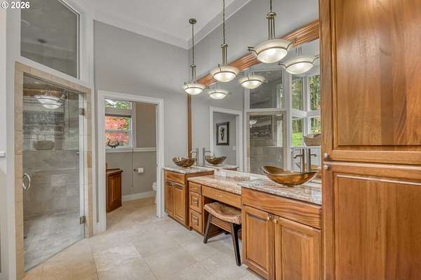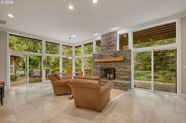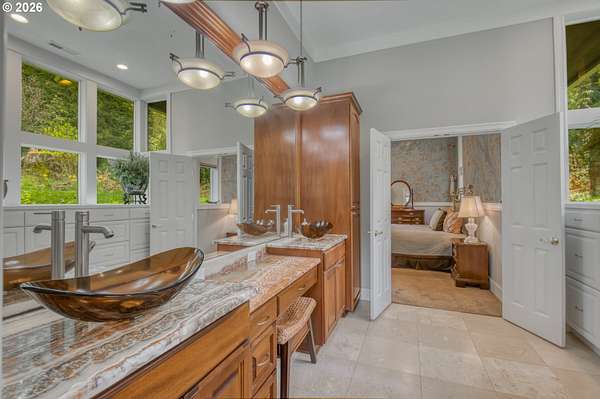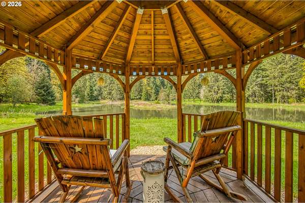 Set on 29.5 private, wooded acres, this cedar and brick estate offers a perfect blend of luxury and rural tranquility. The open-concept interior is anchored by a massive architectural beam and high ceilings, creating an inviting space for both daily living and formal entertaining, all set atop elegant travertine flooring that flows throughout the main living area. The gourmet kitchen is a true centerpiece, featuring durable ceramic tile, custom Brazilian mahogany cabinets, a built-in Sub-Zero refrigerator, and a professional-grade Wolf 6-burner stove with a griddle and double oven. Finished with leather-textured granite and a large island with storage on both sides, the kitchen flows into a great room highlighted by custom built-ins and a magnificent stacked stone fireplace. Large windows throughout provide peaceful views of the 3-acre pond and meadow. The thoughtful split floor plan ensures maximum privacy. The primary suite sits on its own wing, boasting a massive walk-in closet with a hidden bonus storage room and a spa-like ensuite. This private retreat features heated travertine floors, onyx countertops, and a walk-in shower. On the opposite side of the home, is a second primary suite, complete with a jetted tub and walk-in shower. A grand study with chair rail accents provides a sophisticated space for a home office. The exterior is designed to embrace the natural surroundings. Relax on the two-level deck accessible from the great room and secondary bedroom or the covered patio featuring a large skylight. The grounds are a nature lover's dream, with lush landscaping, walking paths for viewing deer and elk, and a productive orchard of apple, pear, peach, and plum trees. The property is fully equipped for hobbies and utility with a barn, greenhouse, storage shed, gazebo, and fenced raised-bed garden. Modern essentials like a whole-house generator, two-car garage, and additional carport complete this exceptional private retreat.