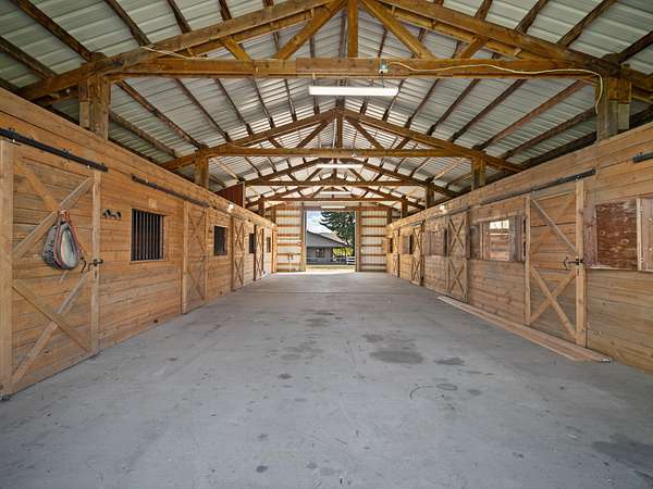 Equestrian facilities are ready for your four-legged buddies, featuring a horse barn, indoor arena space, and multiple equipment/storage outbuildings. The property is fully functional for livestock or hobby farming, with a private pond, gated entry, and well-designed infrastructure throughout.