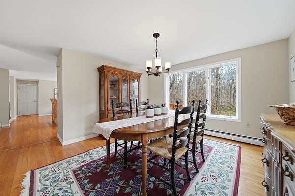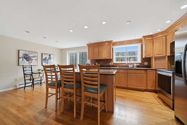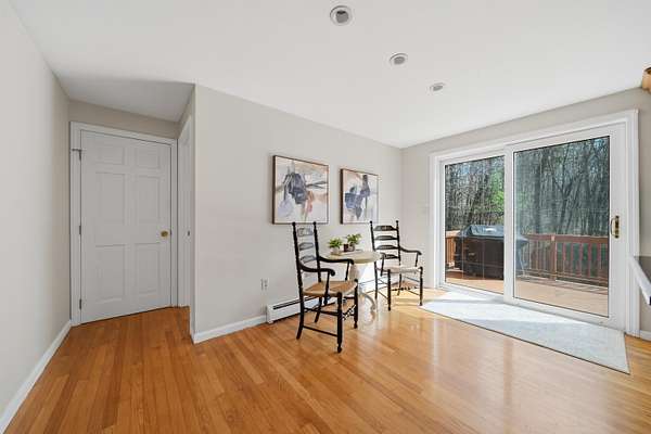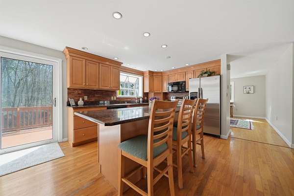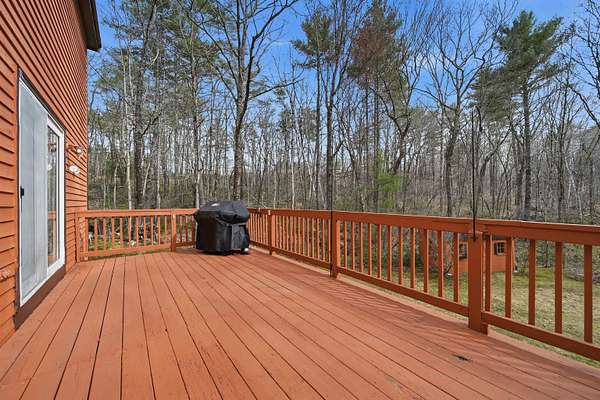 This is your opportunity to own a spacious contemporary home on a quiet cul-de-sac in Bedford. This contemporary home offers privacy and convenience, just minutes from grocery stores, Bedford town center, and with easy access to Routes 101 and 93. Featuring 4 spacious bedrooms and 2.5 baths, the home sits on a beautiful wooded lot with a private, flat backyard ,perfect for relaxing, entertaining, or future outdoor projects. The eat-in kitchen has fresh paint, maple cabinets, granite countertops, stainless steel applicances, and with hardwood floors and a kitchen island for extra seating. The slider off the kitchen area provides great natural light and access to a large deck with access to the backyard. The dining room has fresh paint and hardwood floors, providing extra space for entertaining family and friends. Additional living space includes a family room with hardwood flooring, and a freshly painted den with a working wood-burning fireplace. The first floor half bath includes washer and dryer hook-ups. Upstairs offers four generously sized bedrooms, including a primary suite with a full en-suite bath. A second full bath serves the remaining bedrooms. with an updated shower and newer floor tile. The home also includes an oversized two-car garage with new doors, a paved driveway with ample parking, and a partially finished basement/mudroom with direct access from the garage. While some updates remain this home presents a great opportunity to add value and make it your own. This is your chance to get into the highly desirable Bedford market with space, location, and potential. Book your private showing today through showing time or visit one of our open houses on Sat 4/18 12p-2 and Sun 4/19 12p-2p