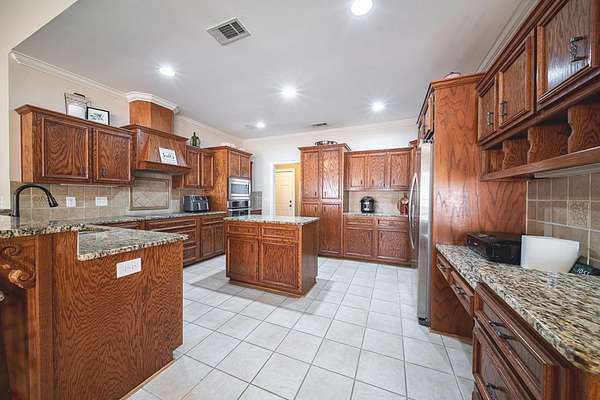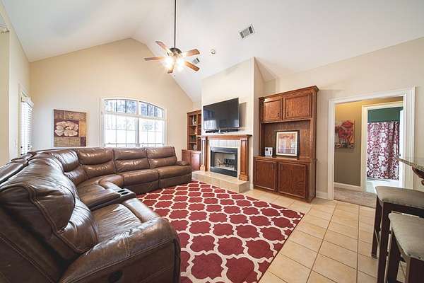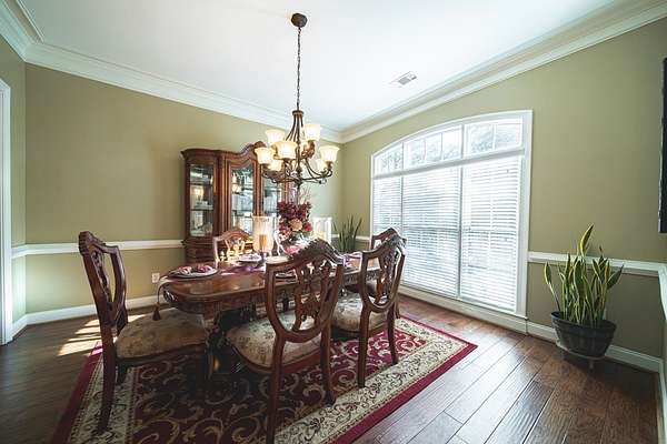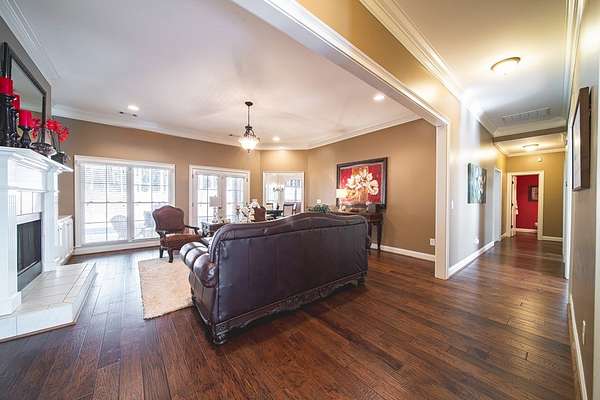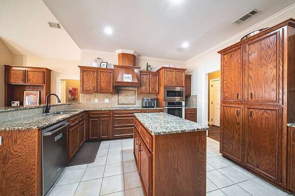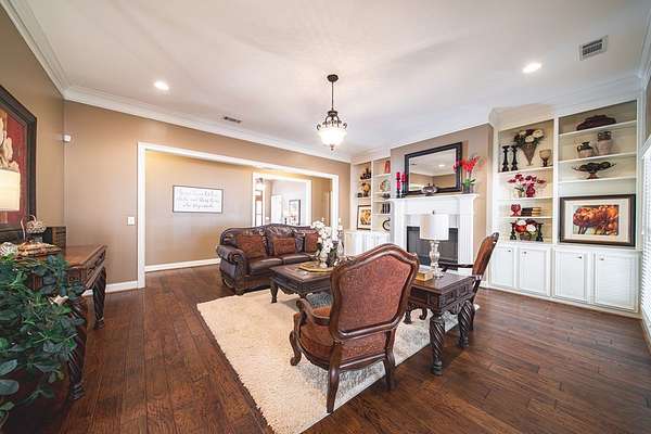 Beautiful single-level brick home situated on a cul-de-sac in Harris County with a circular drive. The front foyer welcomes you into a warm home that boasts engineered wood floors and crown moldings. Formal dining room to the right off entryway. At the center of the home is the living room with wood burning fireplace and built-ins with access to the back covered porch. The open-concept kitchen includes tile flooring, granite countertops, an island, breakfast bar, built-in desk, and pantry cabinet. The adjoining family/keeping room offers built-ins, vaulted ceiling, a second wood-burning fireplace, and additional access to the patio. The split bedroom plan provides a spacious primary suite and guest suite on one side, with two additional bedrooms and a hall bath on the other. The primary suite includes a double step-up ceiling, porch access, two walk-in closets, and an ensuite bath with dual vanities, whirlpool tub, tiled shower, and water closet. Guest bedroom includes its own ensuite bath. Additional highlights include a large laundry room with mud sink, half bath off garage entry, double side-entry garage, sprinkler system, and covered back porch ideal for entertaining or relaxing. Zoned for Pine Ridge Elementary in Harris County Schools.