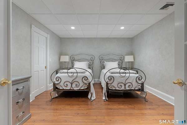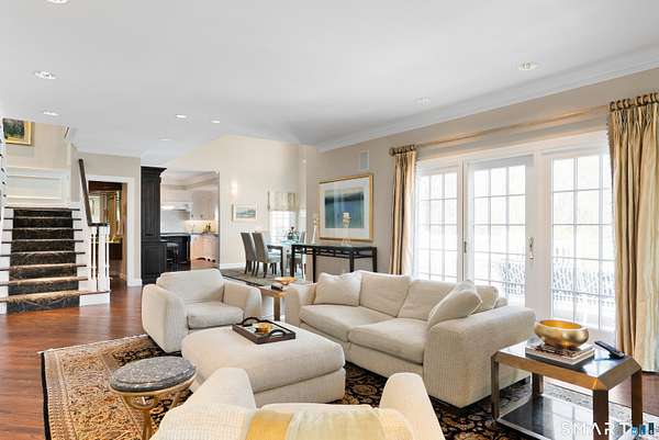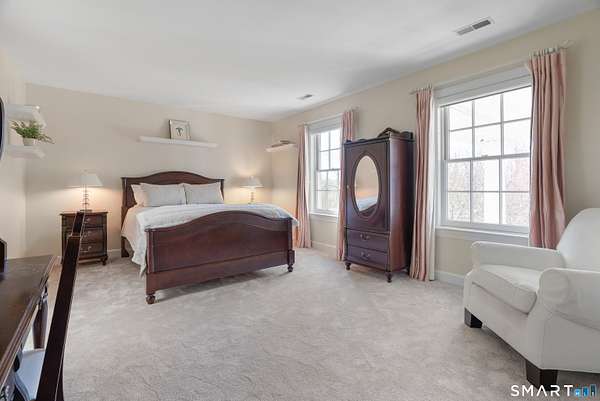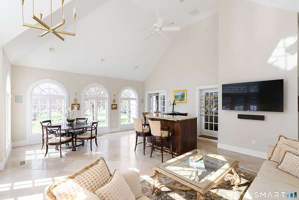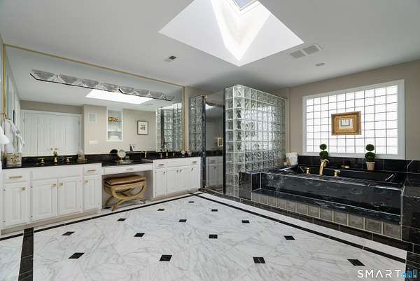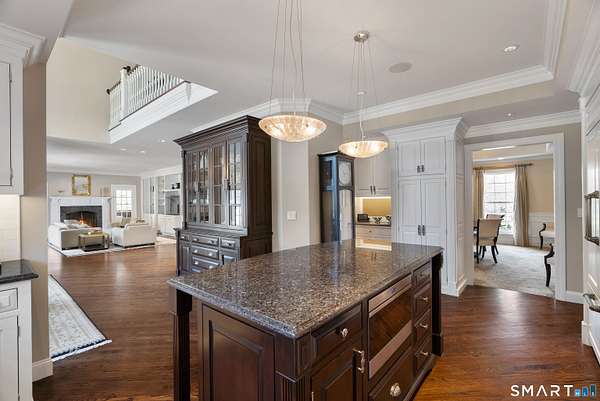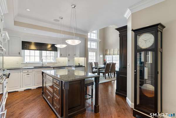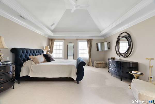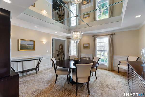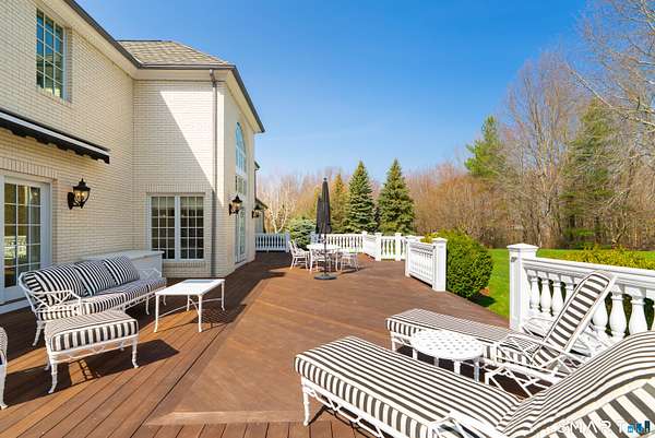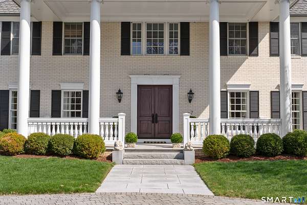 Nestled on 4 private acres at the end of a quiet cul-de-sac in Suffield, this magnificent 1993-built Georgian Colonial offers a commanding presence with an elegant tree-lined paver driveway, grand columned portico, and cream brick facade. Delivering an extraordinary lifestyle at every turn with 6 bedrooms, 4 full and 2 half baths, a 3-car garage, and park-like, professionally landscaped grounds. Inside, you are greeted with a two-story entry leading to a formal living room and a sun-drenched entertaining room with soaring cathedral ceilings, built-in wet bar, walls of arched windows, and French doors opening to the wrap-around Ipe hardwood deck. The kitchen dazzles with custom white cabinetry, a large island with granite counters, gas cooktop, and a tray ceiling. Off the kitchen is a first-floor bedroom/office with a full bath. An elegant formal dining room and cozy family room with fireplace and beautiful built-ins round out the first floor. Upstairs, the primary suite is a true sanctuary featuring a dramatic tray ceiling, spa bath with marble soaking tub, glass block walk-in shower, skylight, and dual walk-in closets. Two more bedrooms with a Jack and Jill bath finish the second level. The finished lower level - with walk-out access and a possible in-law suite with separate entry - includes a home theater, wet bar, recreation room, massage room, and additional bedroom suite. Minutes to golf, Enfield Mall shopping, Suffield Academy, and historic Suffield town center.