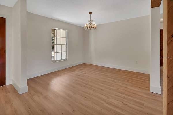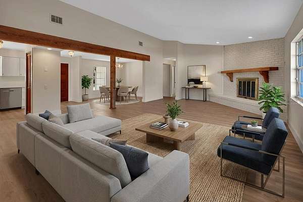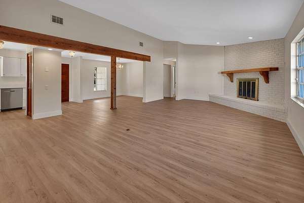 Inside, you'll find brand new vinyl flooring throughout, fresh paint on every surface, new lighting, and stylish ceiling fans. The spacious living area features a charming brick wood-burning fireplace accented with a cedar beam and mantle. A beautiful chandelier highlights the dining room, adding a modern yet classic touch. The new kitchen offers wood soft-close cabinetry, quartz countertops, and a clean, timeless design. Both bathrooms include new vanities.