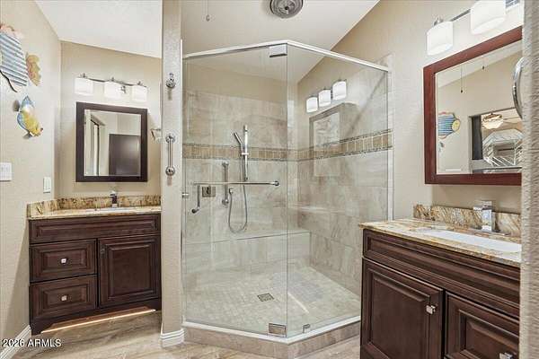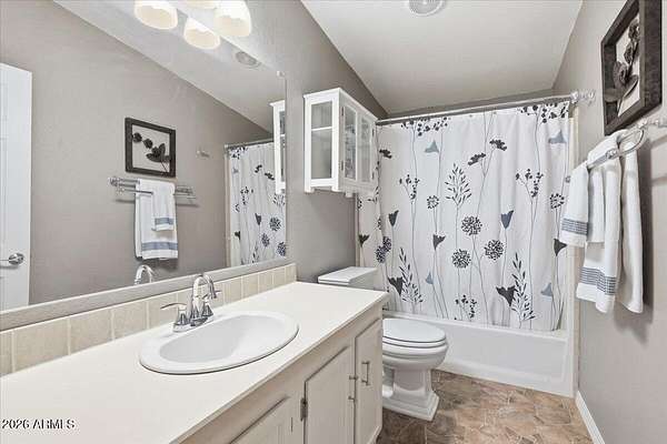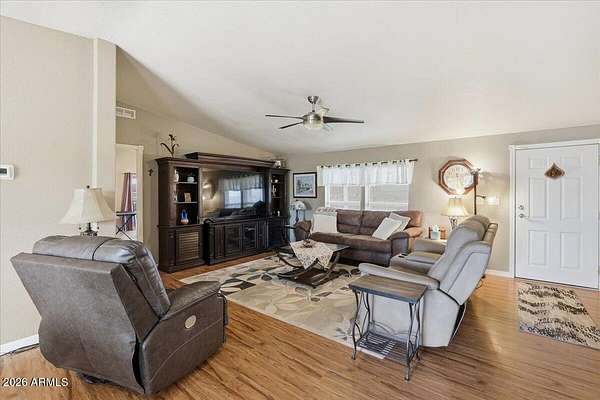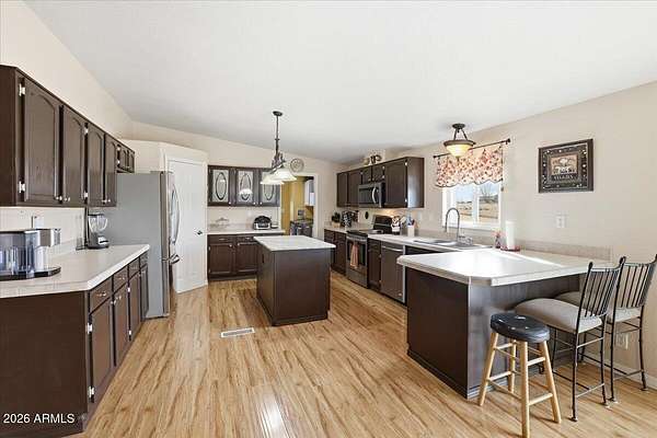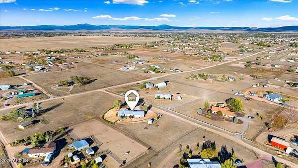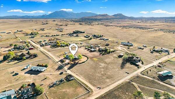 Tucked just off the road on nearly three acres, this immaculate Chino Valley property immediately sets itself apart with towering trees, natural privacy, and a peaceful, park-like setting that feels like your own private oasis. The approach is memorable, with evergreens for privacy, a welcoming circular garden filled with mature plantings, and a flagstone path leading to the front deck. The exterior is as functional as it is inviting, featuring an oversized approximately 1,000-square-foot garage with a two-car door, room for 4-5 vehicles, and exceptional utility. The garage is fully equipped with extensive cabinetry, a built-in workbench, and overhead storage, making it ideal for a workshop, hobbies, or organized storage. Recent upgrades include a new roof, new high efficiency HVAC system and new gutters, adding peace of mind and long-term value. The home is thoughtfully positioned to minimize direct sunlight in the main living areas for enhanced comfort and energy efficiency, while solar tubes further brighten the interior with abundant natural light throughout the day. From the expansive covered front deck, you step into the great room where vaulted ceilings and wood-look flooring create an open, airy feel. This space flows seamlessly into the dining area and kitchen, making it ideal for everyday living and entertaining while staying naturally cool and comfortable. The open kitchen offers a striking contrast with dark cabinetry, crisp white countertops, stainless steel appliances, and a pantry that blends style with functionality. The fully remodeled primary suite is a true retreat, filled with natural light from two large picture windows. Barn doors lead to a spacious walk-in closet as well as a beautifully updated ensuite bathroom featuring dual vanities with granite countertops, a custom-built linen closet for additional storage, and a stunning glass-enclosed walk-in shower. On the opposite side of the home, two additional bedrooms each feature vaulted ceilings, ceiling fans, and spacious closets, and they share a nicely appointed bathroom with a tub and shower combination. An oversized laundry room provides built-in storage cabinets, a utility sink, and convenient access to both the primary suite and the garage. Outside, the usable acreage offers endless possibilities. Multiple outdoor living areas include both front and back decks, established flower beds, and a storage shed, with plenty of room to create an equestrian setup or expand outdoor amenities. The property is horse-friendly and perfectly positioned to capture sweeping nearly 300-degree views of Granite Mountain, the San Francisco Peaks, and Mingus Mountain, offering a rare blend of privacy, functionality, energy efficiency, and breathtaking surroundings.