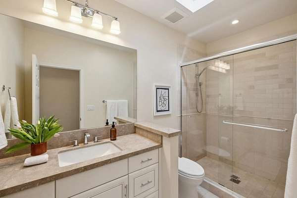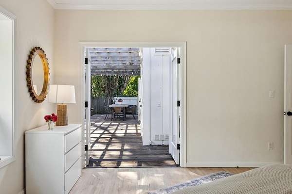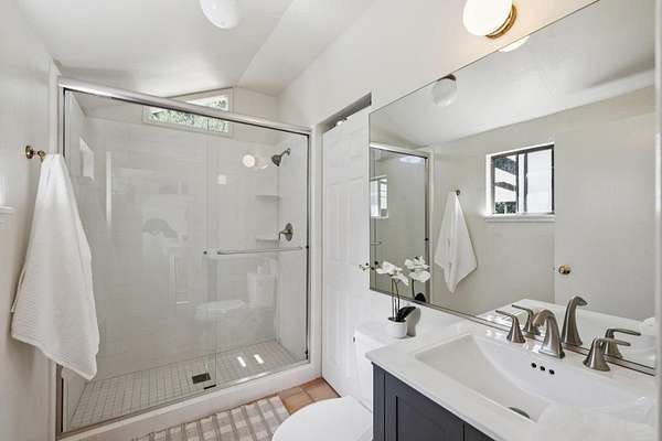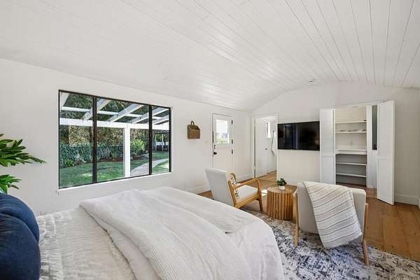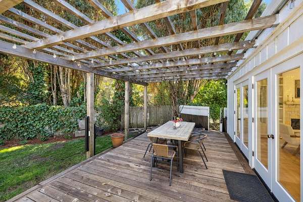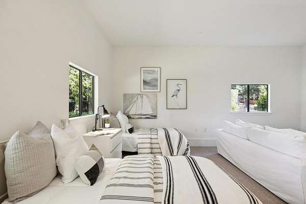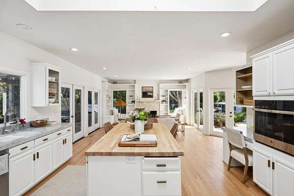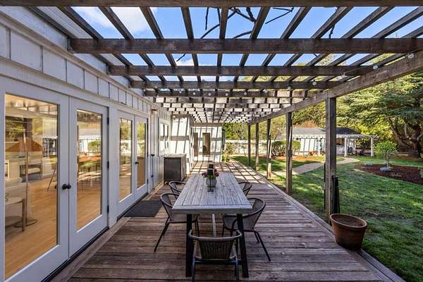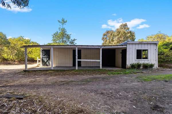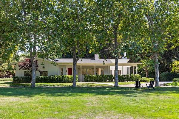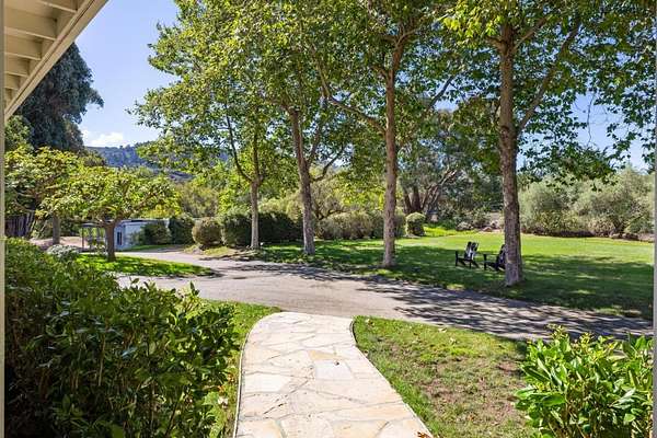 Nestled just two miles from Carmel, this property offers a serene escape on 1.8 acres of lush landscape. Surrounded by the soothing sounds of the Carmel River and whispers of the leaves this haven reveals a charming residence with expansive lawns and vistas. The single-story main home features a beautifully appointed three-bedroom, two-and-a-half-bath layout with light-filled spaces and an inviting eat-in kitchen. A stone fireplace, custom bookshelves, and refinished oak floors are enhanced by a skylight that illuminates marble counters and high-end appliances. With ample windows and doors leading outside, the living area extends to outdoor spaces, ideal for entertaining. The primary suite, a tranquil retreat, features a bay window overlooking a private fenced yard and deck. The spacious bath offers a spa-like experience with granite and stone finishes. A standalone one-bedroom, one bath guest house provides versatile space for guests or an office. Enjoy breathtaking southwest mountain views, framed by lawns and olive trees. The grounds include a two-stall barn with paddocks, a workshop, and a tack room. The property is supported by its own irrigation well and CalAm water service. This is more than a home; it's a place to celebrate life in Carmel Valley with friends and family.