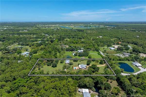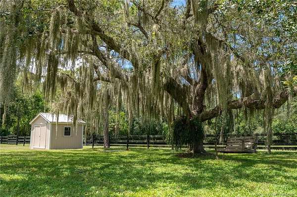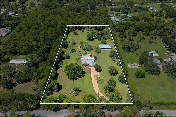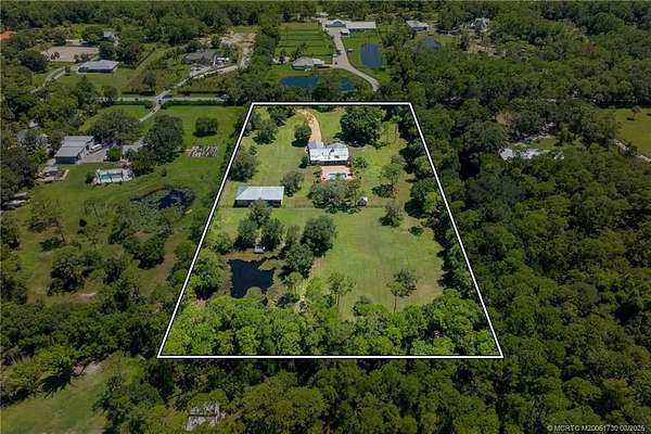 Welcome to this well-cared for 4BR/2BA home w/ extensive outdoor amenities. Enter through a gated driveway to a fully fenced property shaded by mature oaks draped w/ moss. Set on 5 acres, the property offers privacy, space & equestrian potential. Enjoy outdoor living w/ a screened brick-paver patio, open-air pool & massive 40x70 pole barn (perfect for hobbies, vehicles, or equipment) + additional storage shed. Acreage allows for plenty of room for stalls, paddocks, or a riding ring. Inside: A stone fireplace w/ mantle, well-appointed kitchen w/ SS appliances, granite countertops & ample storage. Extras include breakfast nook w/ property views, formal dining, laundry w/ utility sink & storage, & spa-style sunken tub/shower finished in travertine w/ more property views. Peaceful lifestyle in a top-rated school district. A rare opportunity to own your very own private retreat in Palm City Farms!