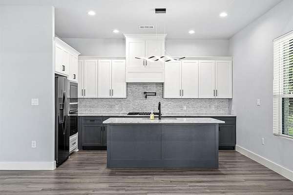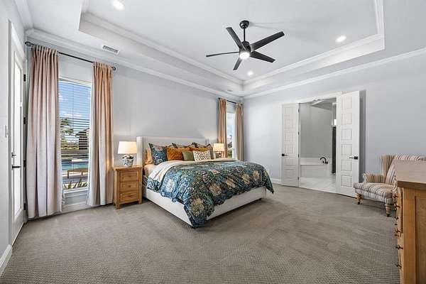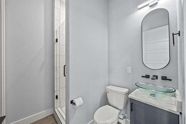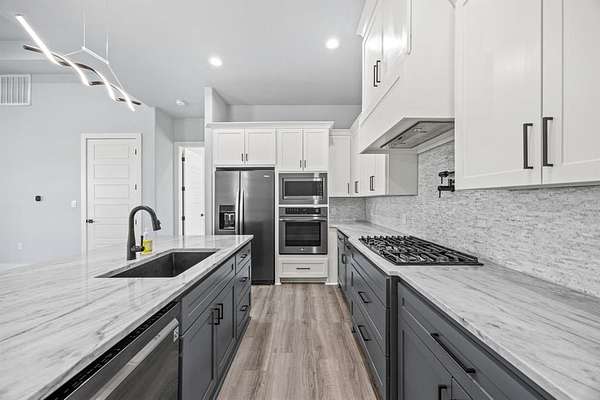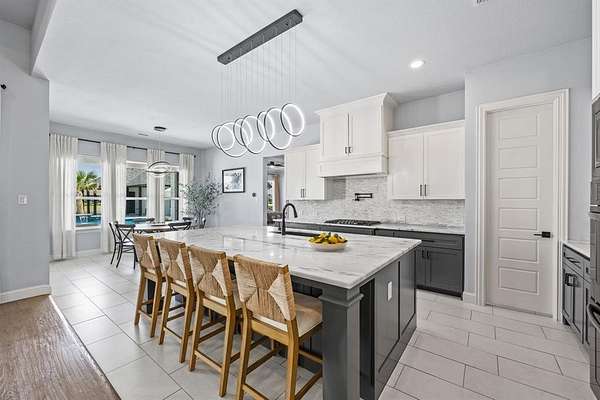 The main residence is a custom 5-bed, 5-bath home designed with open living in mind. Soaring ceilings and walls of windows flood the space with natural light, while a 12-foot stone fireplace creates a dramatic centerpiece in the living room. The chef's kitchen is equally impressive with marble countertops, a large island with breakfast bar, mosaic backsplash, gas cooktop, and designer lighting that flows seamlessly into the breakfast nook. Hardwood floors run throughout, and a private office with French doors plus a state-of-the-art media room with surround sound, 120-inch screen, and 4K projector elevate the home's livability. The primary suite is a true retreat with raised ceilings, direct backyard access, and a spa-inspired ensuite featuring dual sinks, walk-in shower, and custom closet.