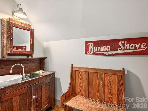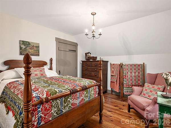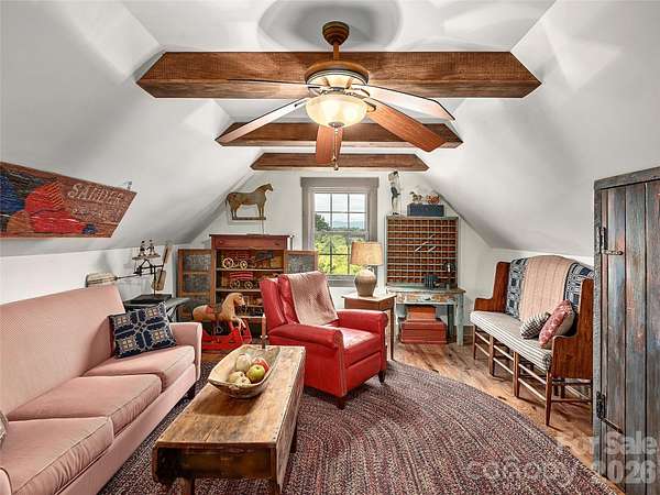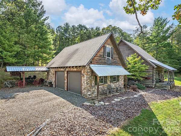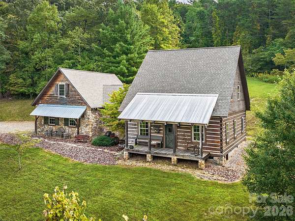 Welcome to this highly acclaimed, custom log home nestled on 13 acres of serene countryside, embodying the essence of rustic charm. It was featured in the Living section of the Asheville Citizen Times (8/20/2013) and the Country Sampler Magazine (9/2015). Crafted by skilled builders, this residence boasts a unique blend of primitive antique aesthetics and modern comforts. The living spaces exude warmth and character with knotty pine floors gleaming in each room. Kitchen appliances are hidden by antique doors and furniture carefully curated to resonate with the spirit of yesteryears. Revel in the long-range views that paint a picturesque backdrop to daily life. Savor the ambiance of the large sleeping porch, inviting relaxation and tranquility. Outside, a 2-stall barn and spring-fed pond offer opportunities for equestrian enthusiasts. Multiple potential homesites across the property offer rare flexibility for future expansion or additional residences. Don't miss your chance to call this unique and remarkable log home yours and experience a slice of early American heritage in modern times.