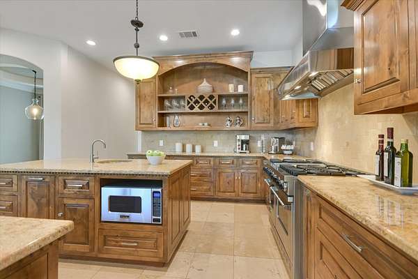 - Bookcases, Cathedral Ceiling(s), Ceiling Fan(s), Crown Molding, Double Vanity, Kitchen Island, Master Downstairs, Natural Woodwork, Open Floorplan, Pantry, Soaking Tub, Stone Counters, Storage, Walk-In Closet(s), Wired For Sound