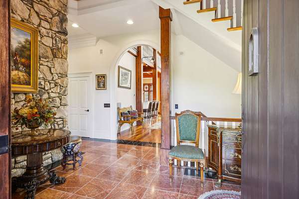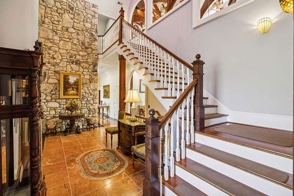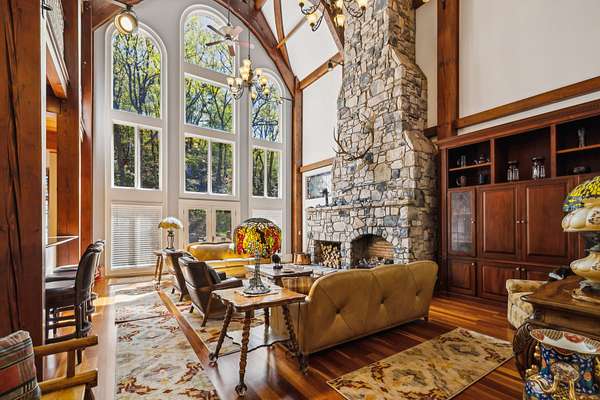 Great Room: A stunning 38-foot ceiling with a stone fireplace and a mahogany entertainment center, featuring ornate timber framing and stained glass windows.