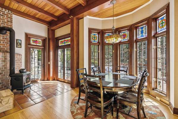 Kitchen: Chef's kitchen with a wood-burning stove, breakfast nook, and two pantries.