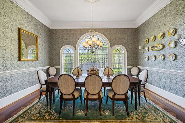 Dining Room: Features extensive molding, built-in cabinets, and new custom wallpaper.