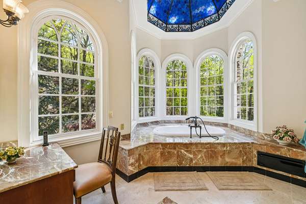 Master Suite: Includes built-in cabinets with a gas fireplace and fan blower, his-and-her baths, a jetted tub, three sinks, a bidet, heated floors, a towel warmer, and dual closets. The suite connects to the sunroom and a large wood and slate patio with a hot tub, offering serene views and sounds of the mountain stream.