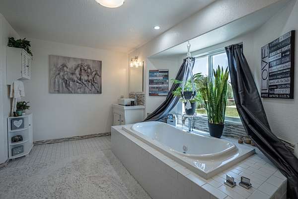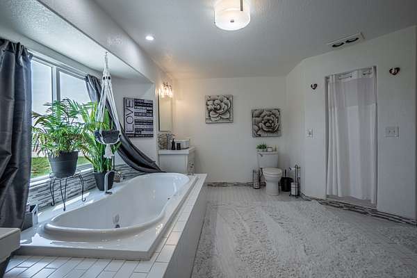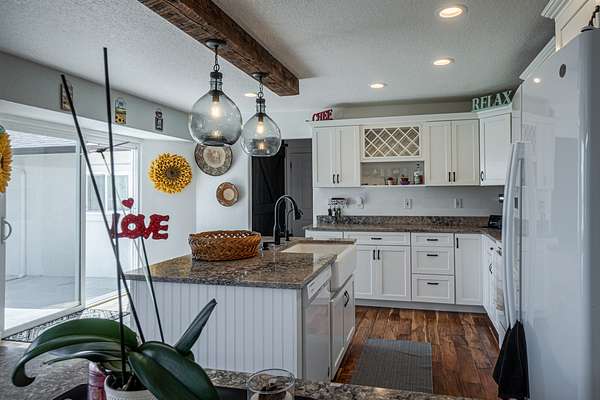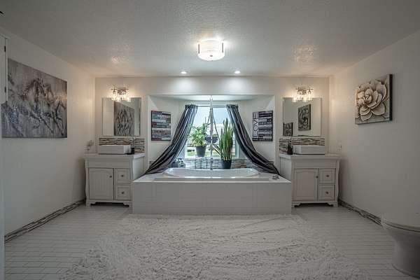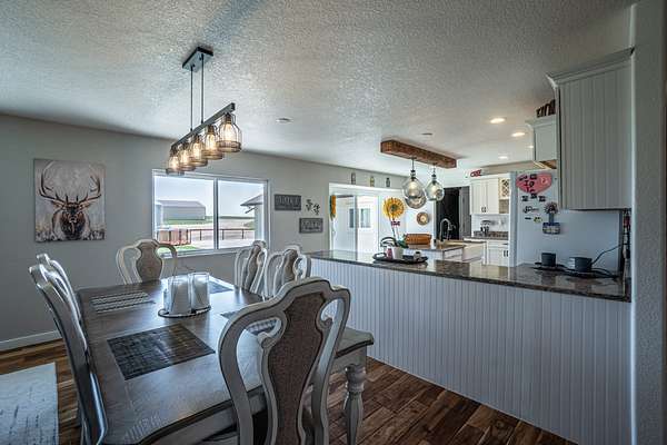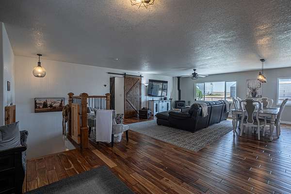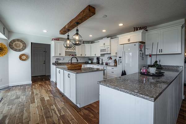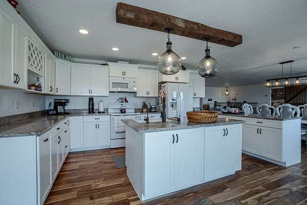 The primary residence is a well-designed, custom-built, ranch styled home constructed in 2015, offering 4,620 square feet of finished living space across two levels. The main floor has an open-concept layout with hardwood flooring throughout, highlighted by a spacious country kitchen complete with granite countertops, white cabinetry, and a large center island. This chef's kitchen flows seamlessly into the dining and living areas, making it ideal for hosting family and friends. The master suite is located on the main level and features a luxurious five-piece bath, including a soaking tub, dual vanities, and an oversized walk-in tile shower. An additional bedroom and full bathroom are also found on the main floor.