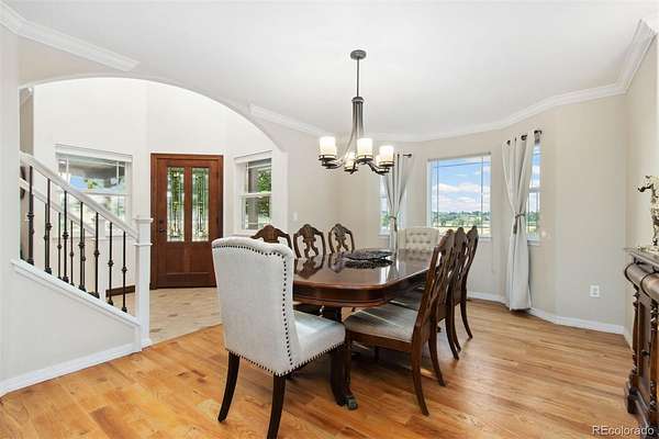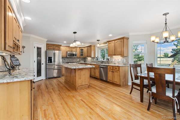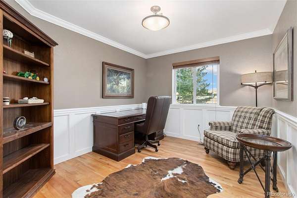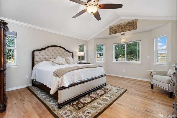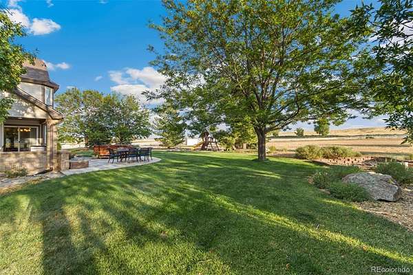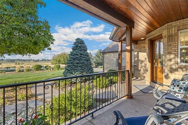 A rare opportunity in southwest Loveland, this stunning 5.1-acre horse property blends custom craftsmanship, peaceful acreage living, and unbeatable outdoor access. Thoughtfully designed, the home lives like a ranch with more than 2,000 square feet on the main level and a layout that feels open, warm, and filled with natural light. Inside, hardwood floors lead you through a spacious great room anchored by a custom cherry gas fireplace. The kitchen is built for gathering, featuring a large center island, walk-in pantry, gas cooktop with oven, and granite countertops. A formal dining room, generous office, and a serene primary suite, complete with soaking tub, walk-in shower, and large closet round out the main level. Upstairs offers three bright bedrooms and a full bath, while the finished basement expands your living space with a rec room, gas fireplace with custom cherry built-ins, an additional bedroom and bathroom, and abundant storage. Step outside to a beautifully landscaped oasis with over 50 mature trees, wide-open views, and quiet surroundings thanks to open space on both the north and south sides. Evenings are best spent on the back patio with a firepit, grilling area, and hot tub (negotiable). The property is fully set up for horses with fenced areas, water spigots throughout, a horse water station, and a 48' x 21' loafing shed/shop. A large pad is already in place with gas and electric installed for a future outbuilding. Recent upgrades include Class 4 shingles, new gutters, and fresh interior and exterior paint within the last three years. Outdoor enthusiasts will love the direct access to horseback riding, nearby hiking and biking trails, and multiple lakes just minutes away. This area is also a road-cycling favorite. Golfers will appreciate being close to four courses, including a quick 5-minute drive to TPC Colorado at Heron Lakes. Acreage, privacy, views, and a beautifully maintained custom home this property delivers the full Colorado lifestyle.