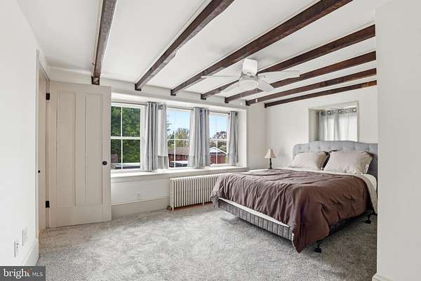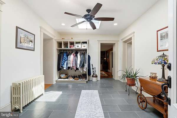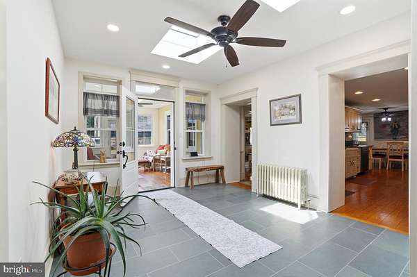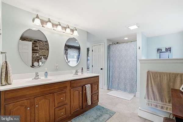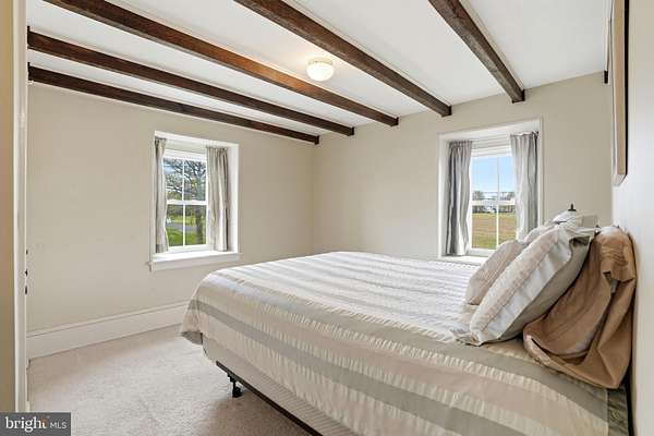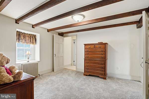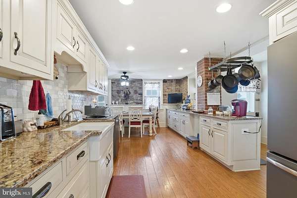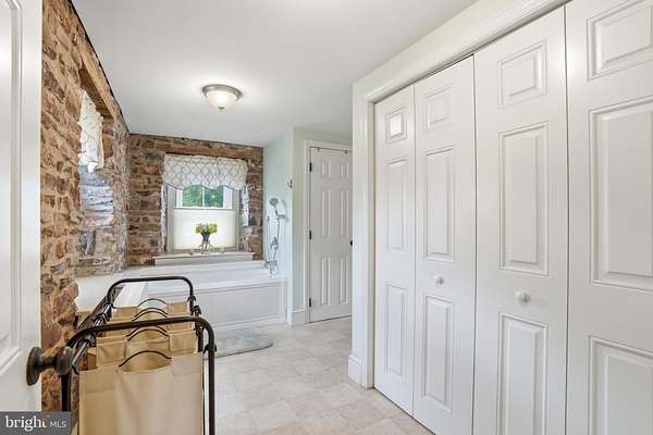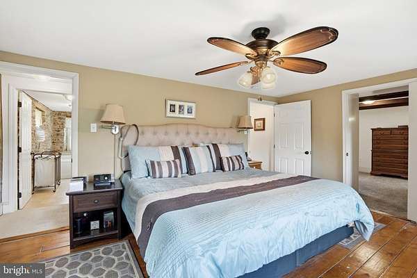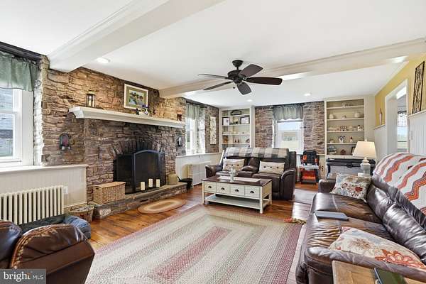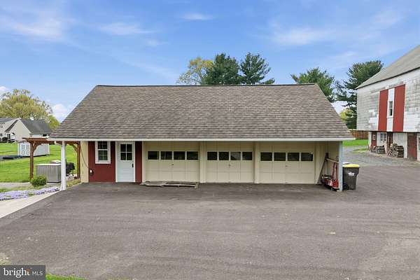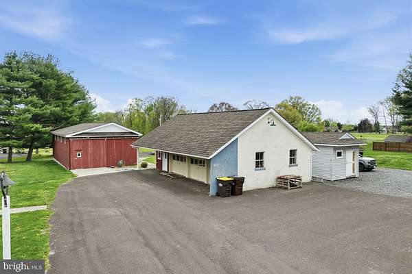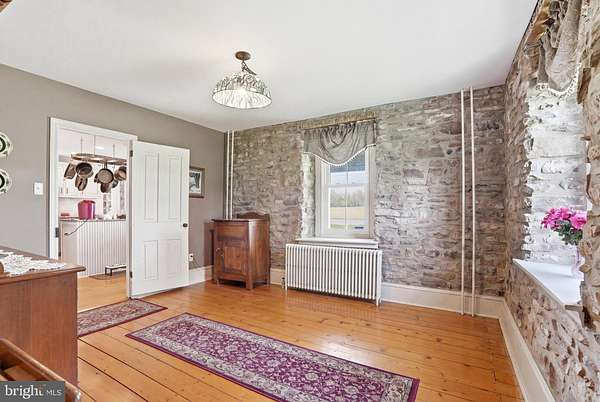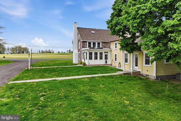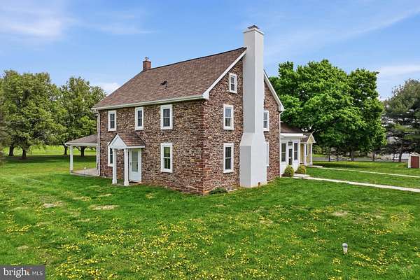 This circa 1756 stone farmhouse is rooted in tradition and is a salt of the earth authentic colonial era home that radiates quiet dignity and rustic simplicity. It's a historic home that has grown over time, blending original 1750s craftsmanship with later additions. It was crafted from local indigenous materials, "such as roughhewn logs, native fieldstone and original wide plank floors. It's a timeless piece of colonial history that has weathered and evolved over 250 years. It's situated on a 2.45-acre lot that is adjacent to a 48-acre farm field that yields corn or soybean crops annually. You will enter the home through a bright cheery sunroom. It's a perfect place for your plants and the dogs or cats to lounge in the brilliant sunlight. It boasts of wide plank hardwood floors and skylight. Next is the spacious foyer with a convenient slate floor and convenient closets and shoe racks. Imagine yourself snuggling up in the warm and inviting family room on a cold winter night. This haven features exposed stone walls surrounding a wood burning fireplace. There are built in cabinets and bookshelves, wainscoting, wide plank hardwood floors and exposed hand-hewn beams. It will be the gathering place after a family dinner. The large country kitchen has been remodeled and features classic beaded inset cabinets, propane stove, microwave, granite counter tops, hardwood floors, deep country sink and stainless-steel appliances. The adjoining breakfast nook is spacious and provides an ideal place for your informal meals or your morning cup of Joe. Overhanging the granite counter tops is a timeless potholder for all of your pots and pans. Directly beyond the eat in kitchen is a formal dining room with exposed stone walls and sparkling hardwood floors. The remainder of the first floor has many possibilities according to your needs. There is a central room that currently serves as an office but could be a possible in-law suite or Au Pair suite. It has an adjoining second kitchen and a powder room. Directly off the second kitchen is a new composite deck for a possible barbeque or evening beverage retreat. A newer addition to the home is a renovated space that currently serves as an office for the current owner. It has many potential uses, and you can use it for your best purpose. The two rooms have high ceilings with very appealing architecture. There is a new high efficiency heat pump for your cooling and heating. Some possible uses are a second family room, home office, in-law suite, game room, etc. Use your imagination. Retire to the second floor to find a large master bedroom area. It features hardwood floors, open beam ceilings and a remodeled bath. The bath includes a walk-in shower, soaking tub for your aching bones and his and her walk-in closets. The remainder of the second floor consists of four additional bedrooms, all of ample size and a remodeled hall bath with ceramic tile floors and glass shower. The third floor of the home features a fifth bedroom that is tucked away quietly. It would make a perfect teenage haven or guest room. The entire home is warm and inviting. It's a perfect blend of old and new and has stood the test of time. The possibilities are endless for the use of the three out-buildings. They include a three-car garage that measures 40x25 feet. It's a perfect place for a serious hobbyist or car collector. It has second floor storage as well as ample floor space. Additionally, there is a pole barn that currently serves as a storage area for the current owner's business supplies. It's complete with a heated powder room and the possible uses are endless. The huge two-story bank barn measures 46x52 and needs some exterior siding repair but is generally in very solid condition. It has enormous possibilities and awaits your finishing touches. There are two smaller sheds as well for tool storage. At the rear of the lot is an old, paved tennis court. It's currently serving as a parking area for trailers.