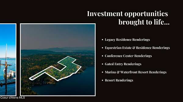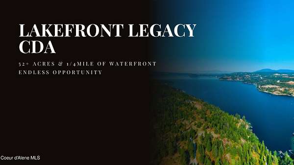 Introducing one of the most extraordinary lakefront offerings ever presented on Lake Coeur d'Alene, a once in a lifetime opportunity to create a true legacy estate on 52 pristine acres with just under 1,400 feet of coveted shoreline. Set along what is often referred to as the Riviera of the lake, this remarkable property rests on a natural shelf of forest and meadow, capturing sweeping, unobstructed views across one of the most beautiful lakes in the world. The setting is both private and awe inspiring, offering a rare sense of scale, beauty, and permanence. Believed to be the third largest privately held waterfront parcel remaining on the highly sought after north shore, the significance of this offering cannot be overstated. While the possibilities for development are vast, the true essence of this property lies in its unparalleled potential to become a generational lakefront legacy. Envision a timeless estate where generations gather, a place where architecture, nature, and lifestyle come together to create something enduring and irreplaceable. With its rare size, commanding presence, and extraordinary frontage, this is more than land, it is the foundation for a legacy that will stand for decades to come. A property of this caliber offers the unique opportunity to create not just a home, but a destination, a sanctuary, and a lasting piece of Coeur d'Alene history.