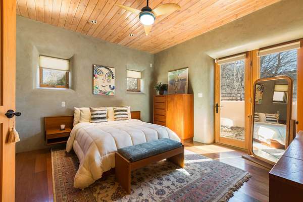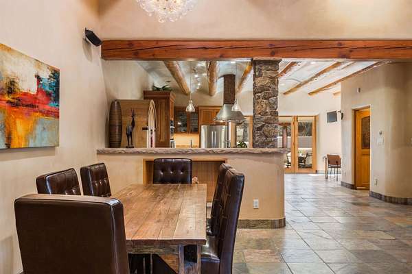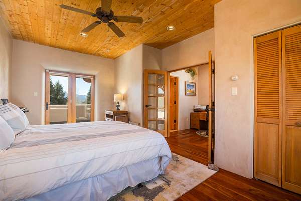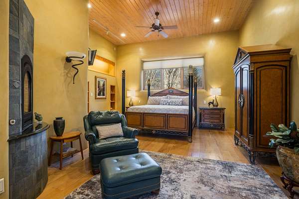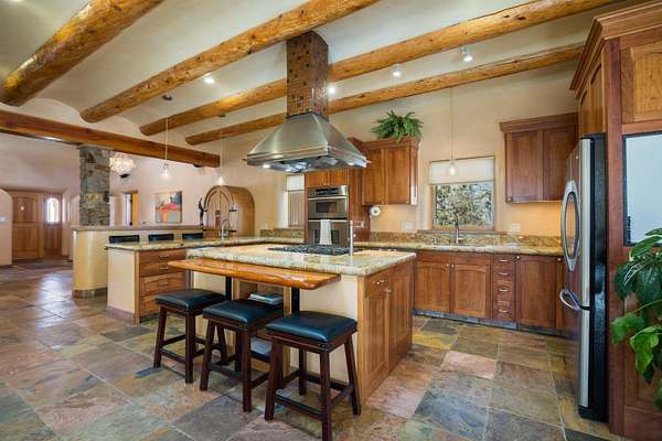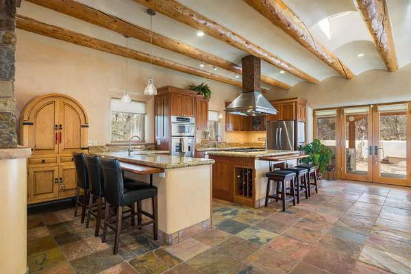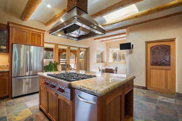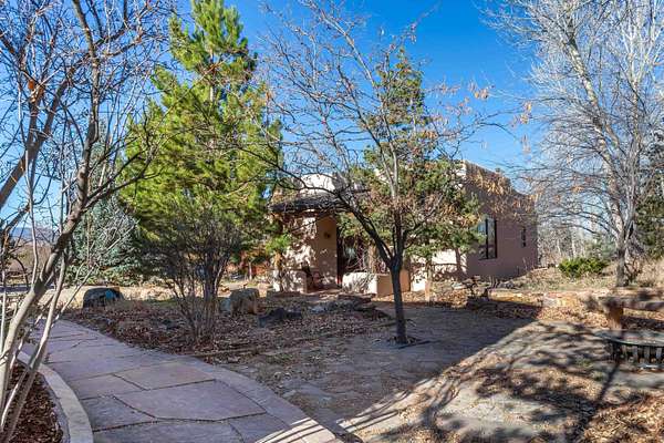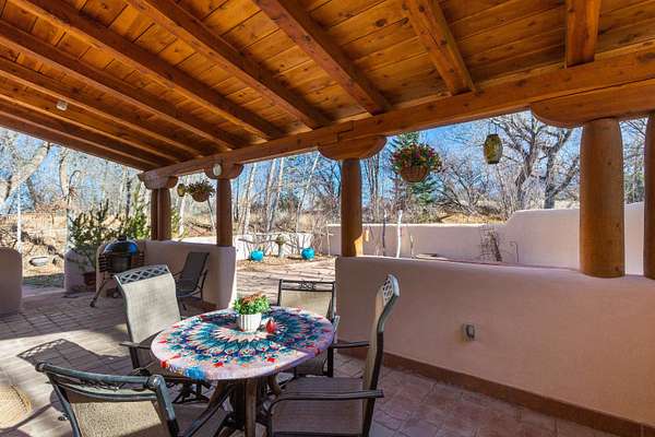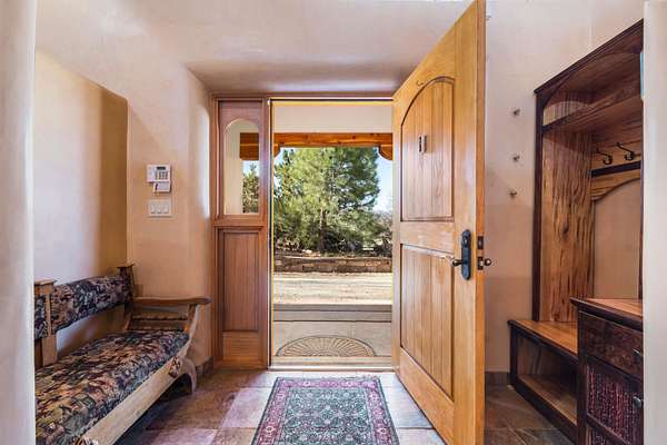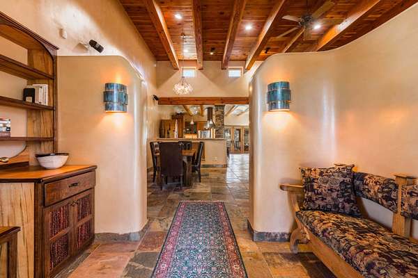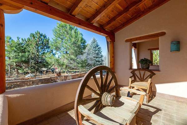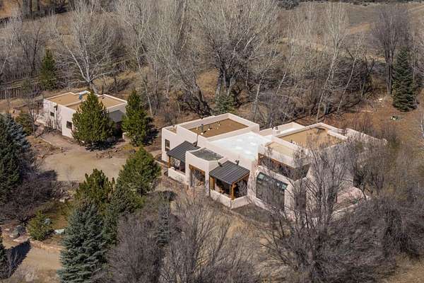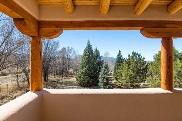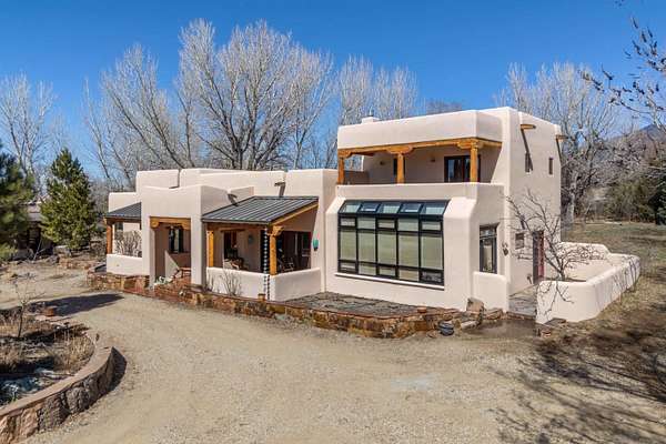 Welcome to Simple Elegance in Taos!! Set within the breathtaking high desert landscape of Taos and minutes from the Plaza. This extraordinary first time on the market, private estate offers a rare blend of timeless Northern New Mexico architecture, artisanal craftsmanship, and self-sustaining luxury. Built by Paul Rotman with substantial 18-inch thick Rastra Block walls, the residence embodies the enduring character of traditional adobe-style design while incorporating refined modern comfort. From the moment you enter through the handcrafted adobe entryway constructed with approximately 100-year-old bricks, the home reveals a level of artistry rarely found in traditional builds. Fourteen-foot ceilings, graceful coved ceilings in the kitchen, and diamond-finish plaster walls tinted with natural mineral pigments create a warm, sculptural interior that reflects the region's rich architectural heritage. The chef's kitchen is both bold and elegant, featuring granite countertops with full bullnose edges, custom cherry cabinetry, double ovens, Wolf range cook top and an intimate breakfast nook. Living spaces are anchored by gas fireplaces and custom stonework by renowned artisan Bob Loveless, complemented by natural stone tile flooring and expansive light-filled gathering areas including a tranquil sunroom. The primary suite offers a luxurious retreat with two primary closets and distinctive green marble accents in the bath, while upstairs cherry wood flooring adds warmth and refinement. Comfort throughout the home is provided by radiant floor heating, supplemental wall heaters, and a Navien high-efficiency boiler installed in February 2026. A charming 1 bath, 1 bedroom casita with tongue-and-groove ceilings crafted from 400-year-old reclaimed wood provides exceptional guest accommodations or private retreat space. Beyond the residence, the property unfolds into an extraordinary multi-use compound. A heated three-car garage, artist studio, woodworking shop with professional dust collection system, and fitness room with full bath and laundry hookups create unmatched flexibility for creative pursuits, wellness, or home-based enterprises. The grounds themselves form a true Taos sanctuary. With 7+ acres with irrigation rights and mature gardens and landscaping surround a productive orchard of apple, pear, apricot, cherry, peach, and plum trees, alongside flowering perennials and majestic Austrian pine, Colorado blue spruce, and bristlecone pines. Additional agricultural features include a tree nursery, chicken coop, bee house, and hoop house. Designed for both sustainability and independence, the estate includes two wells (one solar powered), three cisterns, a five-zone in-ground irrigation system, RV hookups with water and 30-amp service, and a back porch pre-wired for a hot tub-perfect for enjoying the quiet beauty and star-filled skies of northern New Mexico. This exceptional offering represents a rare opportunity to own a private high-desert compound where craftsmanship, land stewardship, and luxury living come together in one remarkable Taos property.