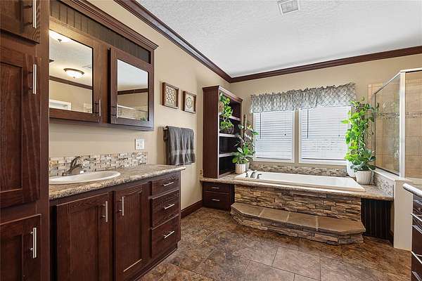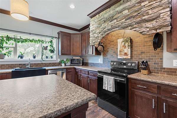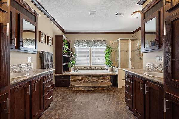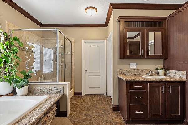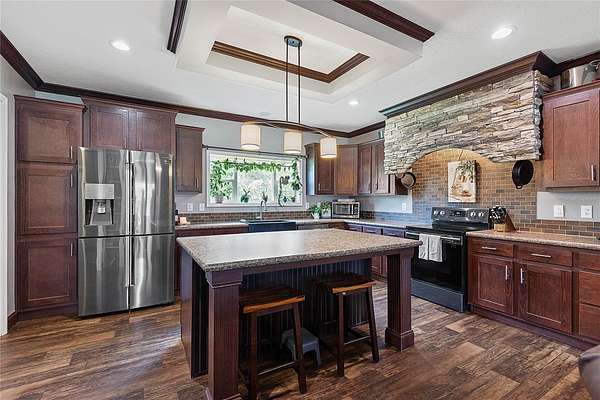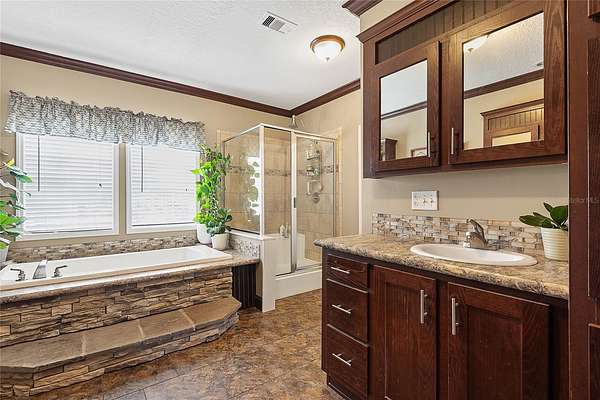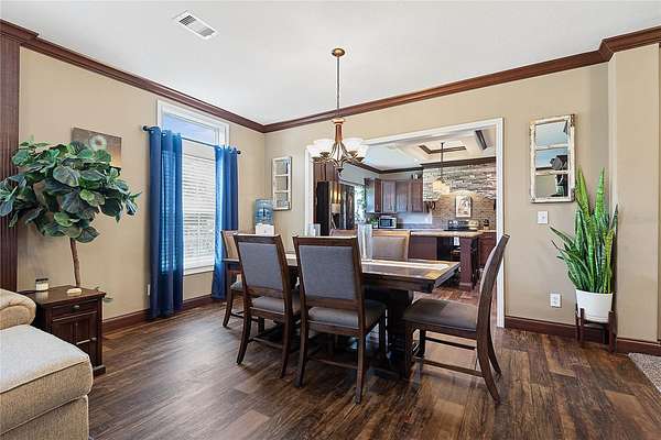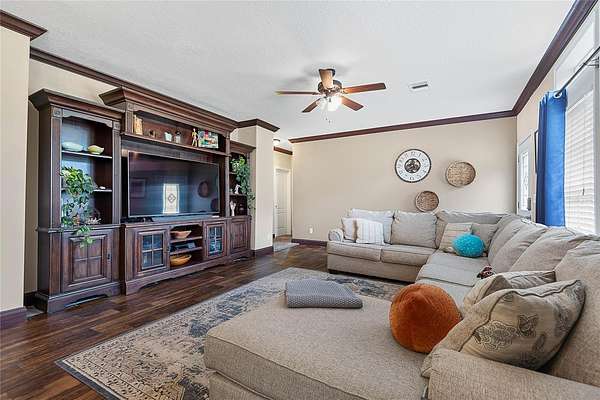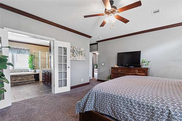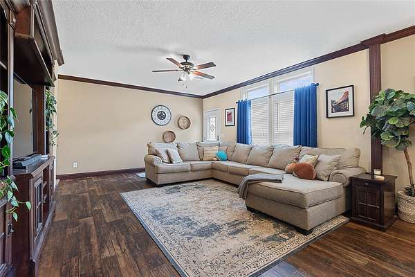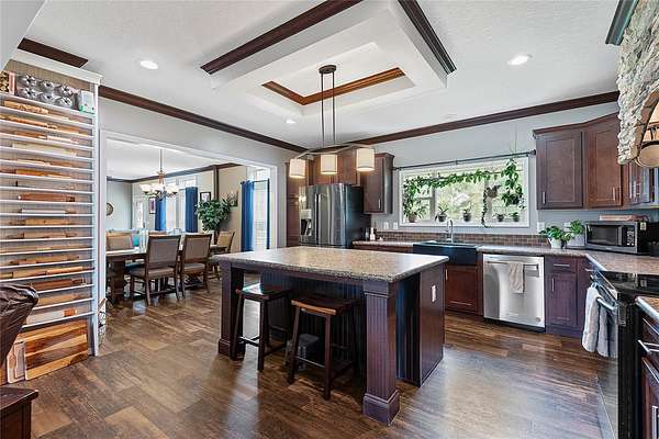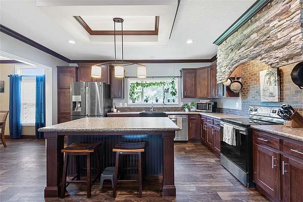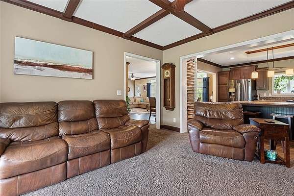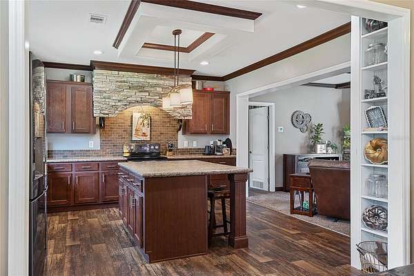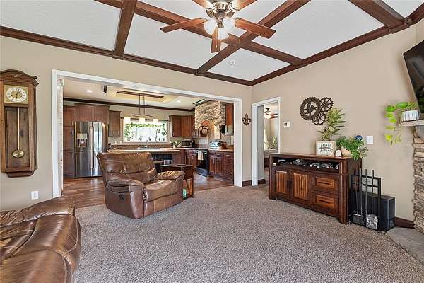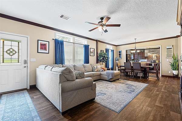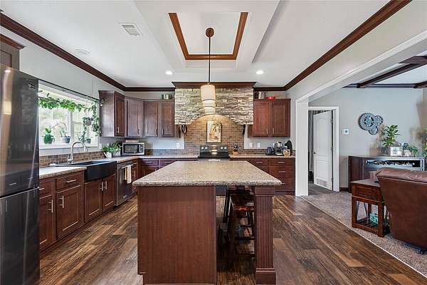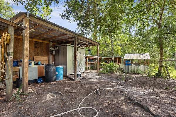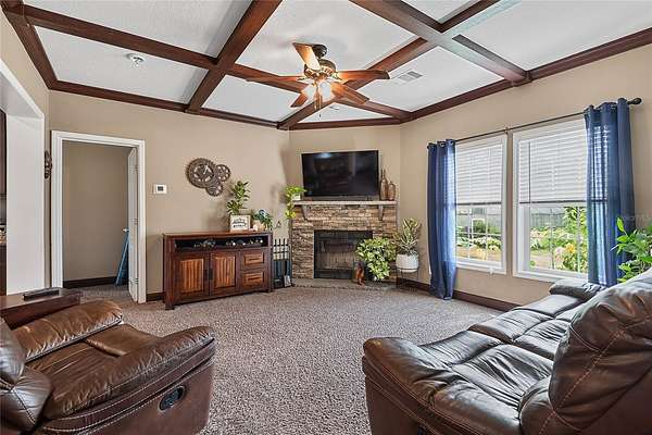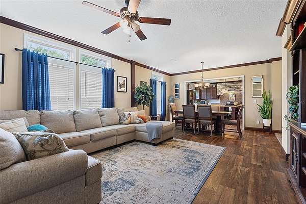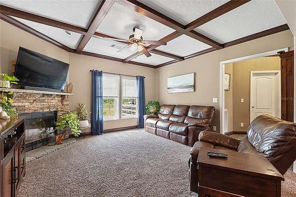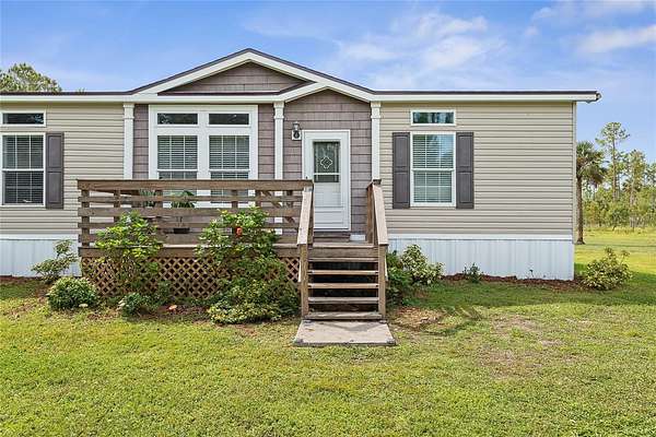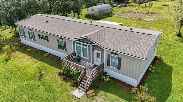 FARM LIFE! Welcome to this established Farmstead set on 5 acres, offering the perfect blend of modern comfort and agricultural charm. The 2019-built manufactured home was thoughtfully constructed with 9-foot ceilings, sheetrock and 2x6 studs, recently upgraded with a brand-new architectural shingle roof, a new AC system, and a 2023 hot water heater. Inside, the home features 4 bedrooms and 2 baths, highlighted by crown molding and coffered ceilings. The great room boasts a custom entertainment center, while the family room offers a cozy stone fireplace for gatherings. The updated kitchen showcases black stainless steel appliances, a newer dishwasher, and a spacious center island ideal for entertaining. The primary suite is a retreat with dual vanities, a garden tub, and a separate shower. Additional conveniences include a large inside laundry room. This property is designed for a self-sustaining lifestyle, complete with 50 fruit trees--including banana, fig, lime, and lemon--along with a greenhouse, shed, carport, and detached garage. Animal lovers will appreciate the dog kennel with heating and AC, accommodating up to five dogs. Two pole barns provide versatile space for storage or farming needs. A rare opportunity to own a turnkey homestead with established agricultural features and a comfortable, modern home. ANIMALS DO NOT CONVEY!