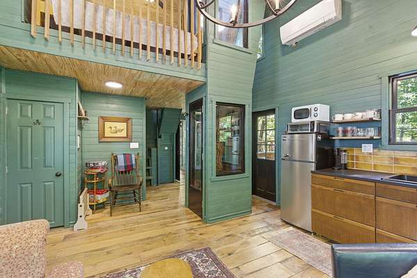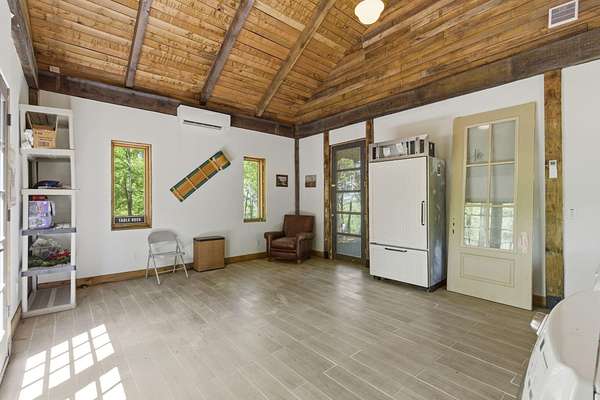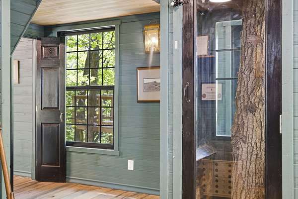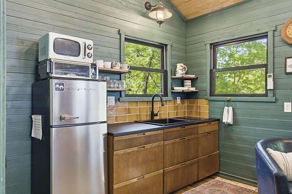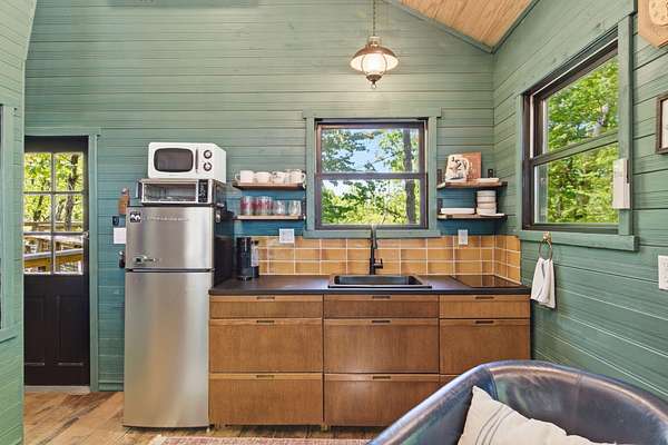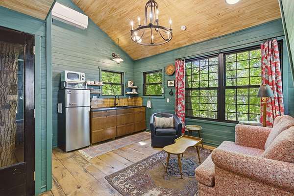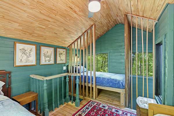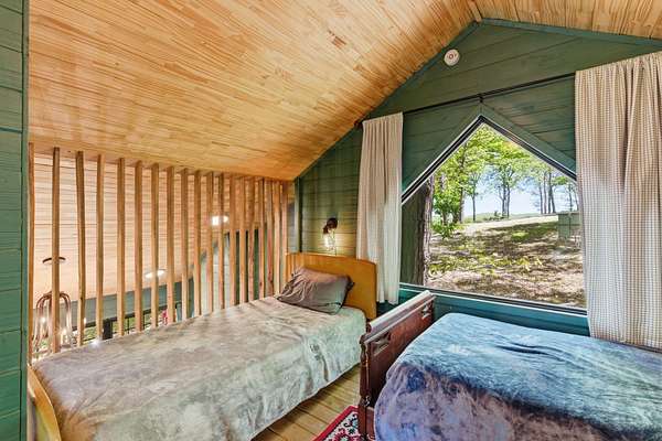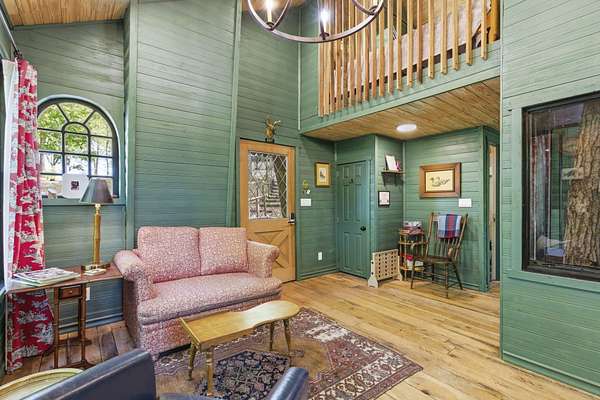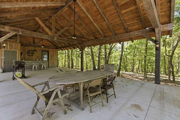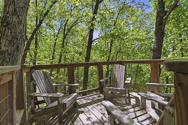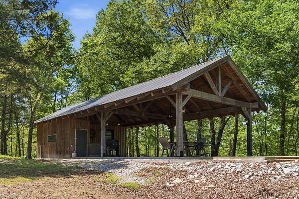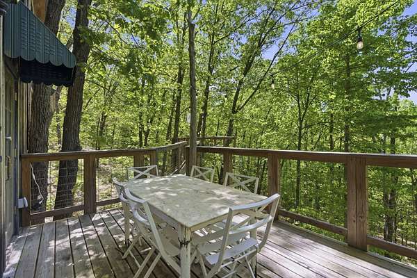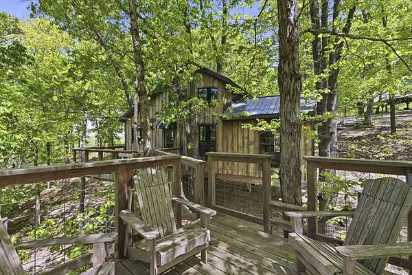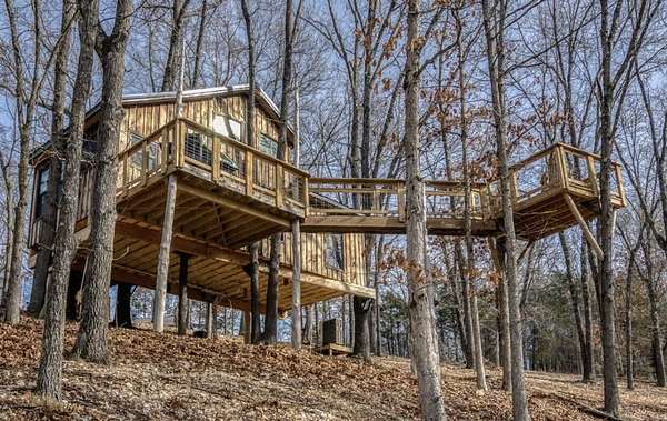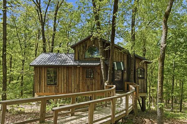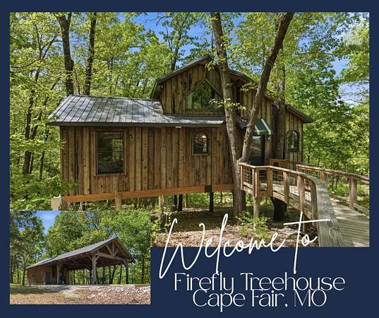 Firefly Treehouse is a one-of-a-kind luxury retreat tucked into a quiet hillside within 33.5 private acres of Ozark landscape. Custom built and thoughtfully designed, this elevated escape offers a rare opportunity to own a truly unique property on land held by the same family for generations. The treehouse was constructed with quality and intention, featuring spray foam insulation on exterior walls, underground electric, a private well, and two septic systems. Rich wood finishes and expansive windows frame sweeping views of the Ozark hills, creating a seamless connection between indoor living and the surrounding natural beauty. Wood flooring reclaimed from the original barn on the property, dating back to the 1970s, adds character and history.The treehouse comes fully furnished. The interior includes a private bedroom with a queen bed and a loft area with three twin beds, accessed by a narrow staircase. With a 3 piece bathroom. The home is positioned on a hillside with natural terrain, enhancing the authentic treehouse experience. A gated entrance provides privacy and seclusion.Outdoor living is a standout feature, with a 52x20 covered pavilion. Within the pavilion is an enclosed 20x15 area with washer and dryer, refrigerator, and sink (not currently connected), 1/2 bath and flexible space for entertaining or storage. Approximately two additional building sites have been cleared for more possibilities.Located about one mile from Table Rock Lake and approximately 25 minutes from Branson, this property offers a rare combination of privacy, craftsmanship, and location.A unique opportunity for a private retreat, second home, or investment property with character and income history.