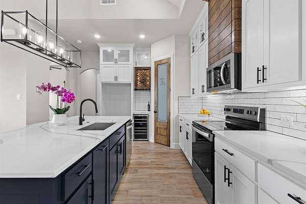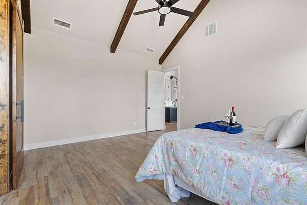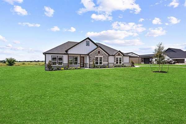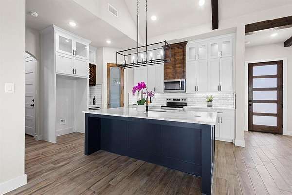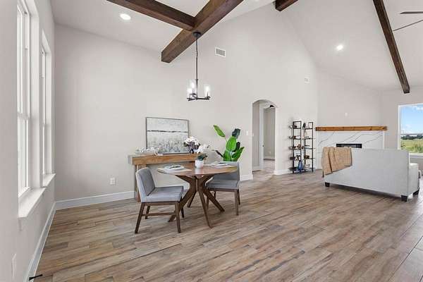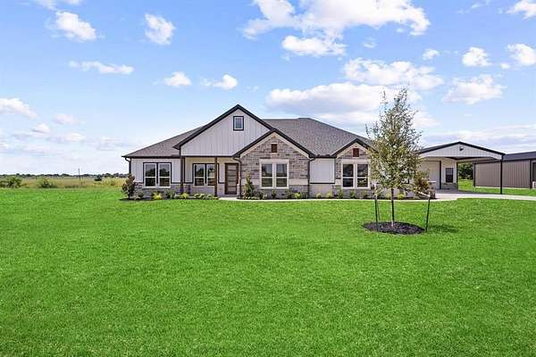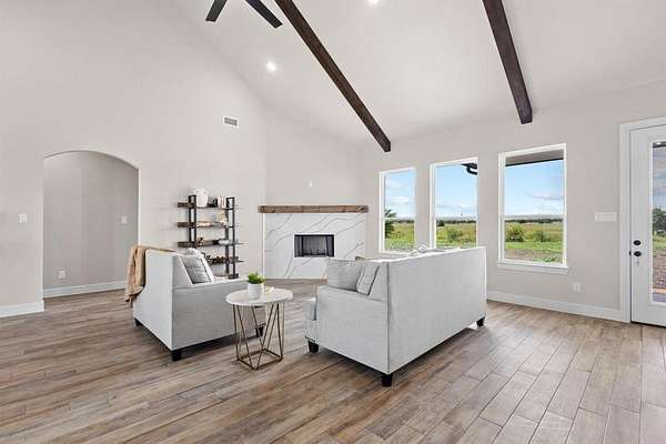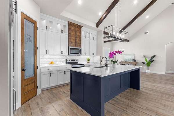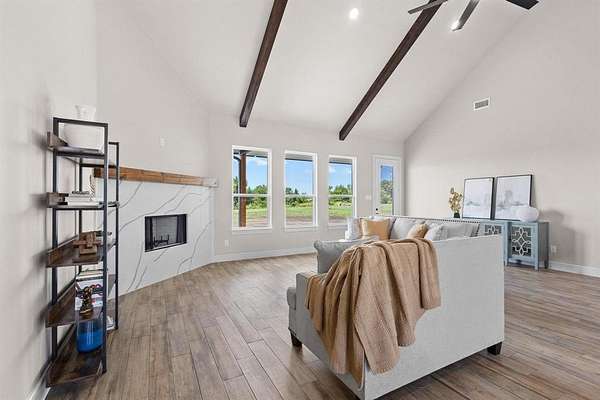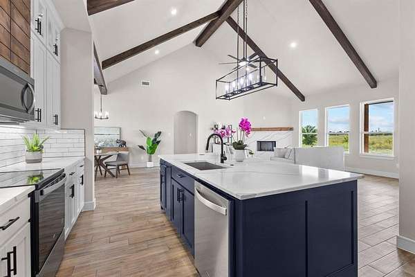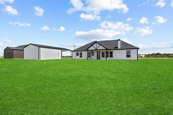 This stunning custom built home combines luxury, modern design, and country tranquility. Featuring a spacious open-concept floorplan with soaring cathedral ceilings, exposed wood beams, and a striking quartz stone fireplace, this residence is perfect for both entertaining and everyday living. The luxurious master suite offers a spa-like retreat with a frameless glass shower, sleek modern tile, dual quartz vanities, and an enormous built-in closet with ample storage. The gourmet kitchen impresses with a walk-in pantry, shaker cabinets extending to the ceiling with glass upper cabinets, backlit lighting, elegant quartz countertops, and a stylish backsplash, ideal for culinary enthusiasts. Situated on just over an acre, this property provides a serene country setting with mature trees, plenty of room for kids and pets to play, family gatherings, or relaxing on the huge covered patio. The property also includes a 30x50 electric workshop - perfect for hobbies, projects, or additional storage. Built with energy efficiency in mind, the home features encapsulating foam insulation and rests on a durable pier & slab foundation, ensuring long-lasting comfort and quality. Experience the perfect blend of modern farmhouse elegance, luxury, and peaceful country living.