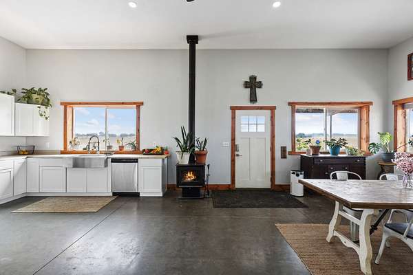 What began as a simple shop has blossomed into an inviting 1,500 sq ft studio style home brimming with charm and practicality. Crafted with Arrow Leaf Construction's signature style, this home is built to keep you cozy through Montana's rugged winters. Inside, a thoughtfully designed True open-concept layout combines living, working, and relaxing spaces. The living area, office nook, bed space, and full kitchen flow seamlessly, complemented by a spacious utility room. With soaring 12 ft ceilings, the home feels open and inviting, while cement radiant floors and a wood stove create an ambiance of warmth and comfort. The metal siding, sourced from the original owner's family ranch in Drummond, adds a unique historical touch to this modern home. Outside, the property offers everything needed for a Montana lifestyle: three corrals, working alleys, and three Miller Buildings (storage shed, greenhouse, and chicken coop). The septic is approved for a 3-bedroom home and shop, allowing room for a future 2-bedroom addition or guest quarters. You'll love the panoramic Mission Valley views, from the rugged Mission Mountains to the rolling pastures. Located just 45 minutes to Missoula and 35 minutes to Polson and Flathead Lake, this property offers the perfect balance of peaceful rural living with easy access to town. The metal siding, reclaimed from the original owner's family ranch in Drummond, adds a touch of heritage to this thoughtfully crafted home. Modern comfort, rustic-industrial style, accessibility, and endless potential, all in one Montana haven.