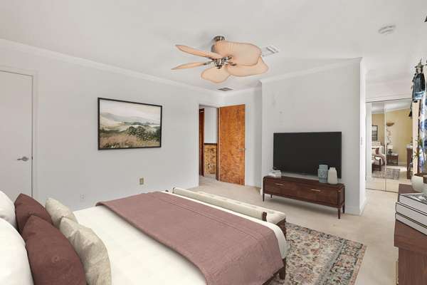- Ceiling Fan(s), Double Vanity, Fiberglass Stall Shower, Jetted Tub, Linen Closet, Primary Downstairs, Stone Counters, Vaulted Ceiling(s), Walk-In Closet(s), Wet Bar