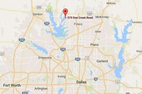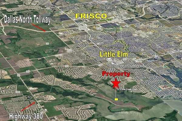 South of Highway 380, from FM 423, head west on Rockhill Parkway to end of peninsula, Valencia on the Lake Development. Before reaching the turn around point, look for signs and turn left (South) to access Doe Creek Road.