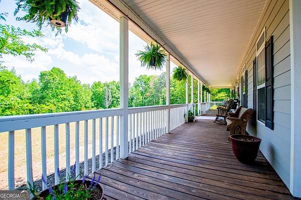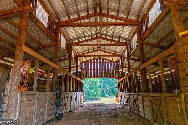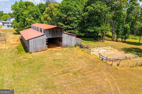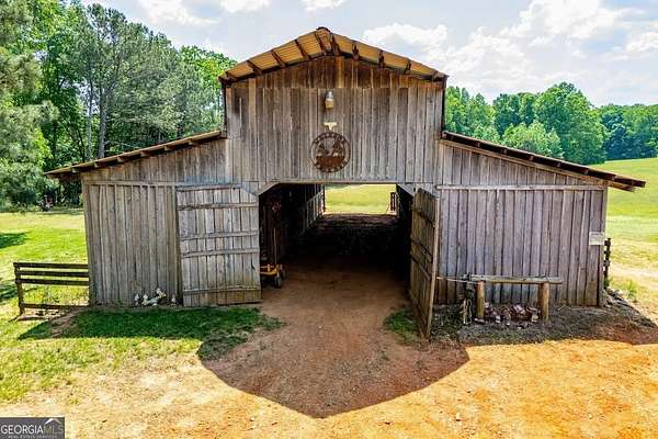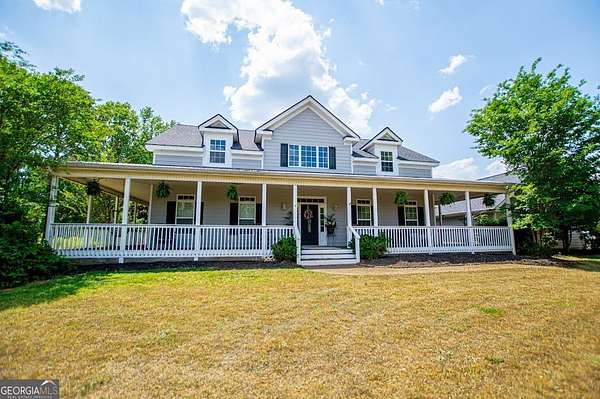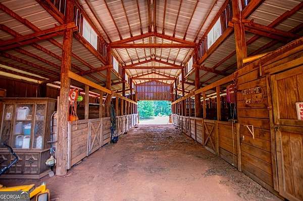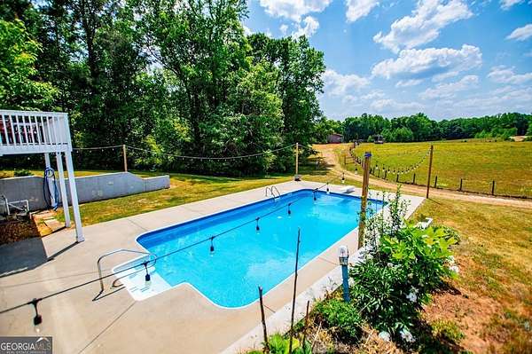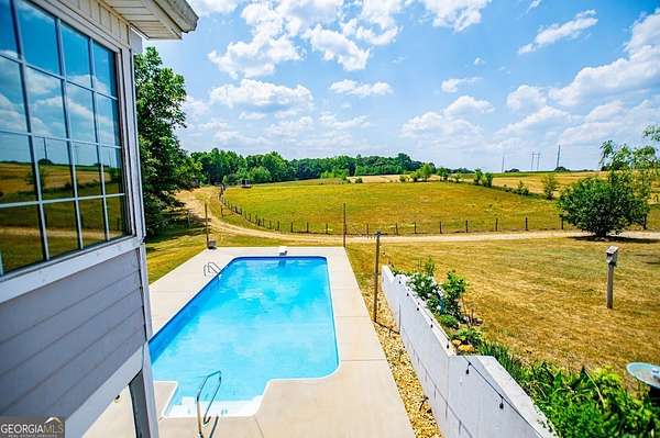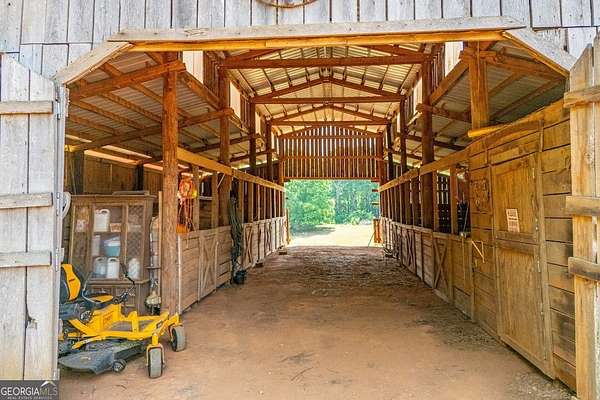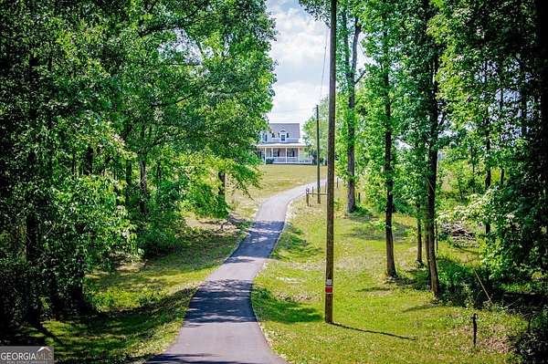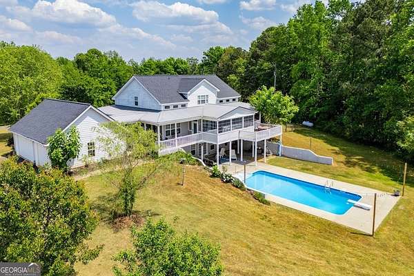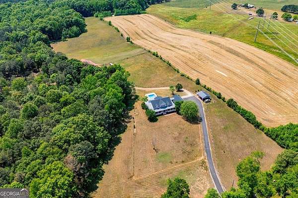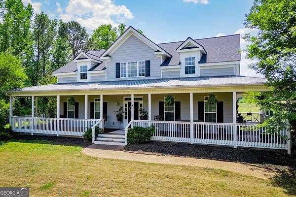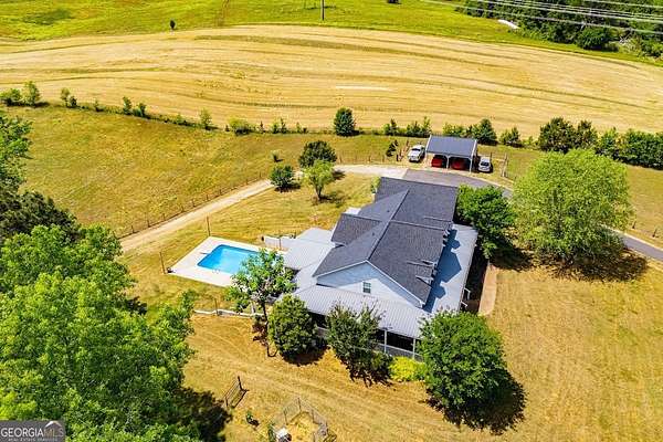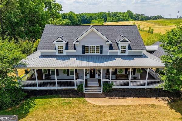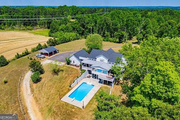 Set on nearly 19 private acres in the desirable Lowell community, 575 Liberty Church Road offers the perfect blend of peaceful country living and thoughtful luxury. Tucked away from the road, this custom-built Southern home welcomes you with a classic wraparound porch and picturesque views of the surrounding pastures. Inside, the home features 5 bedrooms and 4.5 bathrooms, including a spacious owner's suite on the main level. The retreat-style primary suite offers a double vanity, whirlpool tub, separate shower, and a large walk-in closet with custom built-ins and direct access to the laundry room for added convenience. The gourmet kitchen is designed for both everyday living and entertaining, featuring stainless steel appliances, granite countertops, custom cabinetry, and a breakfast bar. Just off the main living space, a bright sunroom with remote-controlled shutters provides the perfect spot to relax. Upstairs, you'll find 2 additional bedrooms, a full bathroom, and a versatile bonus room. The finished terrace level is ideal for multi-generational living or entertaining, featuring a second full kitchen and laundry room, 2 bedrooms, 2 bathrooms, and a living area with direct access to the pool and patio. Outside, the property truly shines. A 40x60 horse barn with 7 stalls and a tack room, multiple fenced and cross-fenced pastures, and a 3-car garage connected by a breezeway provide exceptional functionality. Enjoy the in-ground pool, a fenced garden area, and the added charm of a stream running along the back of the property, all while enjoying the privacy of a home set well off the road with an asphalt driveway. Additional highlights include a roof that is less than one year old and a convenient location near Highway 5 with easy access to Carrollton, Newnan, and the Atlanta airport. This property offers space, functionality, and classic Southern charm in a beautiful rural setting.