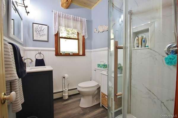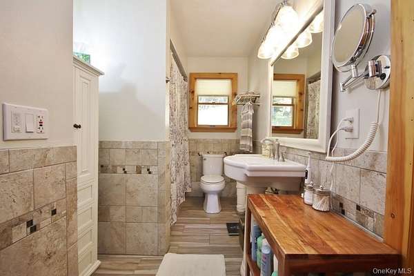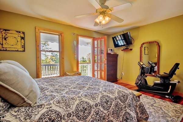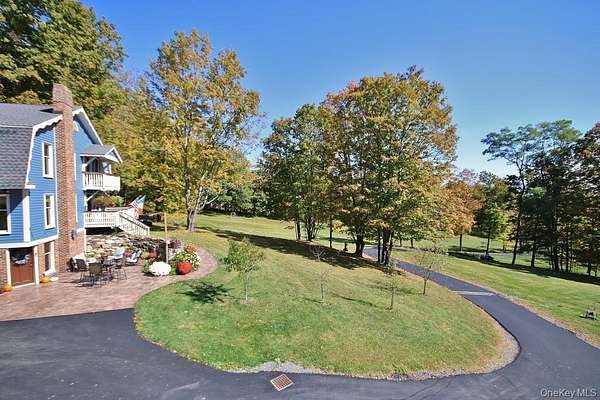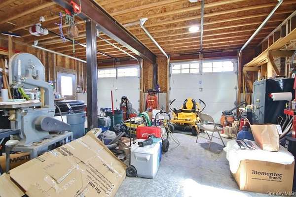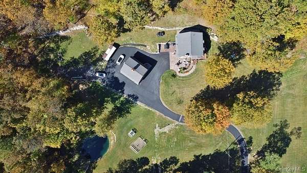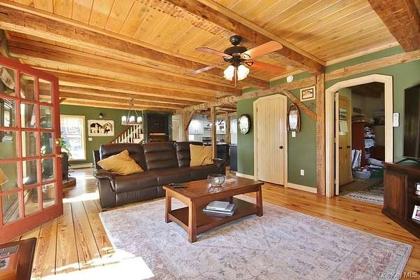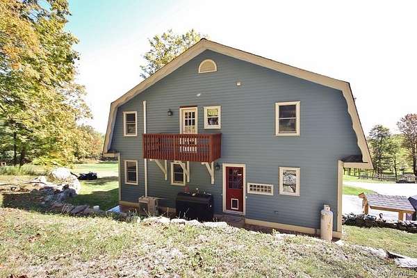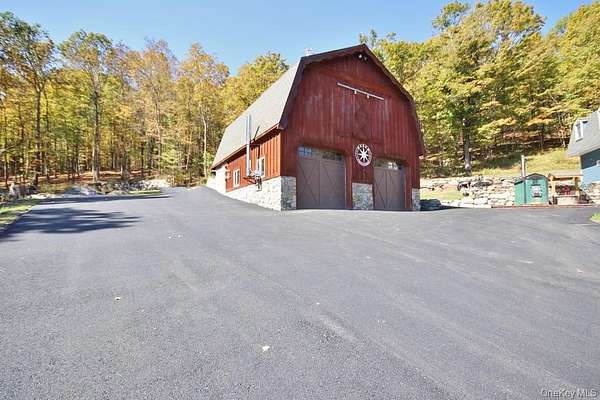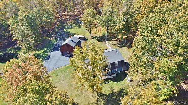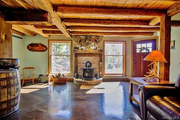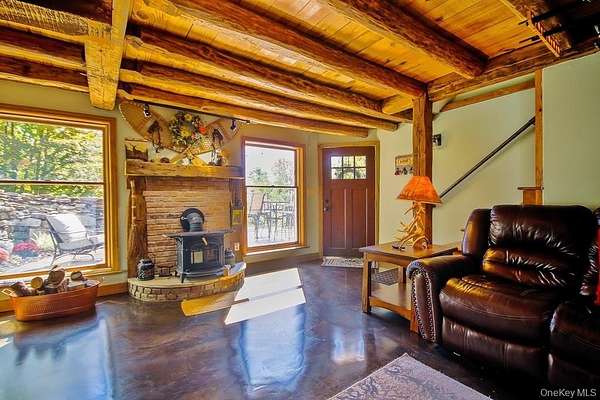 Welcome to your dream homestead. This magnificent 4-bedroom, 2-bathroom log cabin is nestled on nearly 30 private, park-like acres, offering rustic charm with modern comforts. Tucked 500 feet off the road, the property features a brand new blacktop driveway, stocked pond, mature trees, and lush landscaping, perfect for those seeking peace, privacy, and a connection to nature. Inside, the home showcases exceptional craftsmanship with original woodwork, exposed beams, and natural hardwood floors throughout. The spacious kitchen boasts custom white oak cabinetry, sleek polished concrete countertops, and stylish modern finishes. Cozy up by one of two wood-burning stoves, or rely on efficient oil heat with central air and baseboard heating for year-round comfort. The entire home is wired for a full generator backup. The finished basement is a showstopper. Complete with stone walls, exposed beam ceilings, barn doors, a wood-burning stove, and a brick feature wall, ideal as a game room or entertainment space. On the main level, you'll find a large office (or potential 5th bedroom), full bath, kitchen, dining, and living areas. All flowing seamlessly to a walk-out balcony overlooking the scenic yard. Upstairs are four spacious bedrooms and a second full bath. The primary suite features its own private balcony with sweeping views, while another bedroom includes a private deck with backyard access. A massive, detached two-car garage with a loft offers 9' doors, 10' ceilings, 220 amp electric service, and its own wood stove, perfect for a workshop or additional living space. A second driveway with road access adds potential for a second homesite or guest retreat. Upgrades include a newer roof (2020), extensive wood detailing, and meticulous maintenance throughout. Whether you're looking for a full-time residence, vacation home, or homesteading paradise. this one-of-a-kind property delivers beauty, flexibility, and serenity.