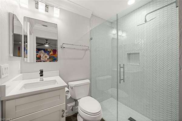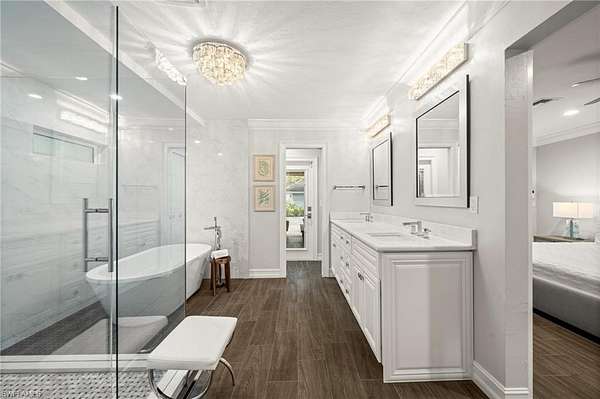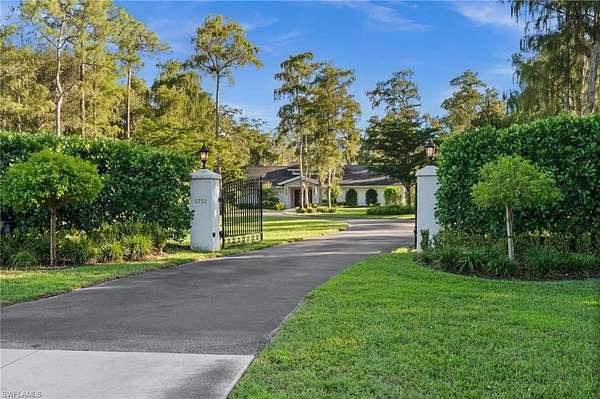 Freshly updated entrance to this FULLY UPGRADED & RENOVATED 4 BEDROOM, 4 BATH, 3-CAR GARAGE* POOL HOME ON 2.27 ACRES OF BEAUTIFULLY WOODED LAND! Setback with an idyllic parklike setting both in front & behind the home, this gated Logan Woods Naples estate offers ultimate privacy while immersing you in peace and nature. This move-in-ready home has been renovated down to the studs & meticulously upgraded including a 2017 NEW SLATE TILE ROOF, ALL IMPACT GLASS WINDOWS, SLIDERS & DOORS, fully renovated/redesigned kitchen & bathrooms, all new wood plank look tile floors throughout entire house, fence with automatic motorized entry gate, gas service via buried propane tank with a whole house generator & a whole house reverse osmosis system. Boasts soaring ceilings & a fantastic floor plan that was reengineered including dual living spaces (one with a wet bar with wine fridge & custom floor to ceiling fireplace mantel), a guest wing that closes off via French doors with 2 bedrooms & 2 full baths & a renovated/expanded kitchen with raised ceilings. The nearly 1,400 sq ft pool deck was expanded with a completely rebuilt & renovated Saltwater pool including spa area with independent hot water spa jets & an in-pool bistro table with seating bench, new travertine marble flooring, & a new picture screen enclosure to maximize the nature views (with upgraded no-see-um screening). Prime South exposure offers ideal sun on the pool & spectacular sunsets over the wooded nature vistas (yard includes automatic sprinkler system & is fully fenced from sides of the house to the rear). The stunning renovated kitchen offers custom white quartz counters, white & espresso colored soft close cabinetry, all new stainless steel appliances including gas range & generous size island with seating. The spa-like primary bath offers white cabinetry & white quartz counters, oversized shower with frameless enclosure, multiple shower heads & stunning marbled tile, a modern freestanding tub & separate water closet. The nearly 1,200 sq ft oversized **3-car garage outbuilding has been divided into a 2-car garage with an air-conditioned storage room (could be converted back to a 3-car garage). Multiple parking areas & long driveways are the perfect place to store a boat, jet skis, etc. Logan Woods offers no HOA fees & a fantastic location 5 mins from I-75, 10 mins to Logan Landings, 15 mins to Mercato & surrounded by fantastic restaurants & entertainment amenities. Home fenced all the way around the property with fresh landscaping.