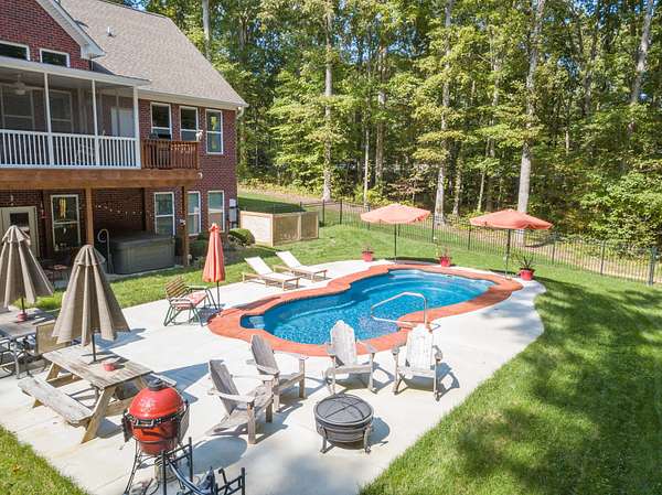 Highlights: expansive great room with soaring ceilings and exposed rustic beams framing views to the resort‑style inground fiberglass pool, hot tub and extensive patio; extra‑large primary suite with deluxe bath and his‑and‑hers closets; chef‑caliber wet bar; oversized theater room easily convertible to a recording/music studio; secure safe room/storm shelter; 16' x 14' built‑in shop; concrete drive and elegant wooden rail fencing. Property includes a cleared, fenced area ideal for pets and abundant outdoor living and entertaining spaces.