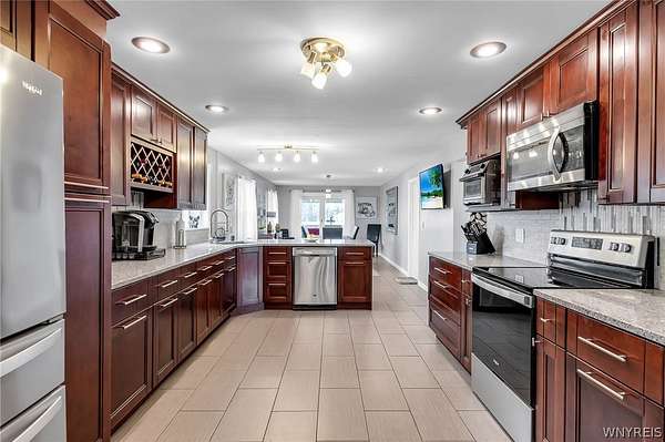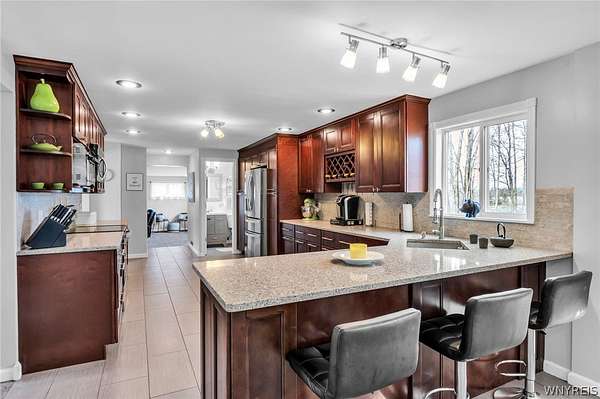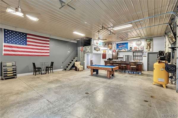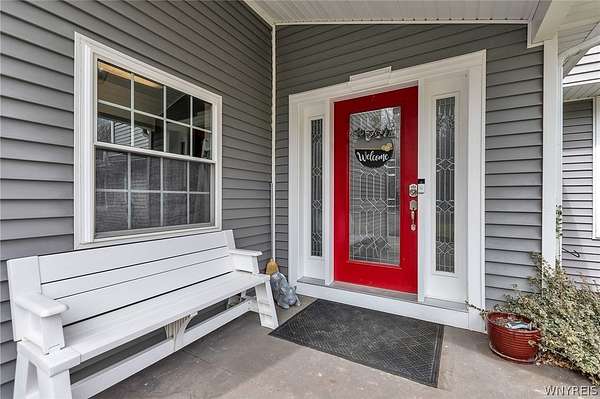 MUST SEE!!! SPACIOUS & beautifully appointed colonial comfortably set in the picturesque Town of Pendleton; move-in ready with highly rated Starpoint schools & steps from captivating views of the Erie Canal. This open-concept & charming home has been completely renovated in 2015 and is truly exquisite with incredible attention to detail and craftsmanship throughout, backing to 55 acres of vacant farm land. Step up stamped concrete stairs through the inviting covered entryway & ornate front door into the living room with a comfortable Osbourne wood stove for brisk spring mornings. Featuring a remodeled kitchen with Cherry, soft-close cabinetry, distinctive Quartz counters w/breakfast bar, subway tile backsplash & floors opening to the dining area & 1st floor office/bdrm. The expansive family rm with a second wood stove is ideally placed to the opposite side and three spacious bedrooms with 2nd floor laundry rm, easily convertible into a 4th bdrm, makes for convenience. Experience the sprawling master suite with private kitchenette, Marble top dual vanities, walk-in tile surround shower with rain & secondary showerheads, complete with dual Juliette balconies overlooking the backyard, perfect for sipping your morning coffee and listening to the birds sing. Outside, enjoy the generous covered & screened-in side deck leading to the lovely 18 x 36, heated in-ground pool with stamped surround and a massive, fenced backyard; an entertainer's dream. The two-car attached garage is ideal and the 30 x 40 fully insulated and heated pole barn with mini kitchen, bathrm w/walk-in shower, has a separate driveway going back, could be a second residence and is all a hobbyist or business owner could desire. Impeccably kept w/luxurious finishes, this desirable home has tasteful updates including mini-splits & carpet 2026, paint & HWT 2025, pool & pole barn 2017, siding 2016, most electric, plumbing, kitchen, bathrms & overbuilt addition all in 2015, yard drainage tile 2013 & much more! No expense spared on this captivating home with low taxes, great schools & close to all conveniences. Showings start 4/1/26.