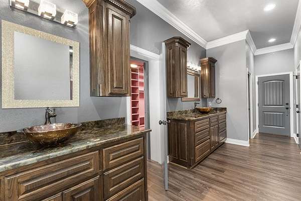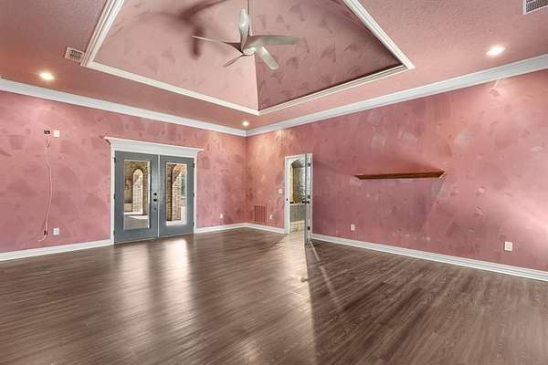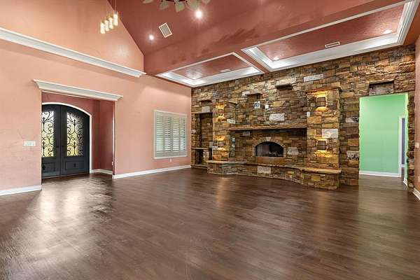WATERFRONT DREAM HOME WITH A HIGH-PITCH LUXURY SHINGLE ROOF! Perfectly situated on 17+ serene acres. Beyond the reinforced slab foundation with deep footings & 30 poured piers, master suite boasts a secure storm closet constructed with poured concrete walls and ceiling -unmatched peace of mind! Owned propane tank conveys! Water supply to large pond in front can be controlled by future owner - water supply may also be used for irrigation. Fully functional water well in addition to metered water supply! Electric Provision & Footings already poured for future entrance gate along with fence posts. Extra deep concrete pad with electrical conduits also ready for a luxe waterside deck or patio. Check out the enormous stamped concrete driveway! This magnificent property also boasts 3 total shops with electricity, and a holding corral! Relax outside underneath the oversized covered patio which features a custom fireplace! Amazingly well-priced custom swimming pool can be built for new owner after close! Ask for a list of amazing features!