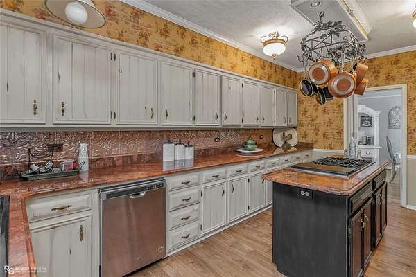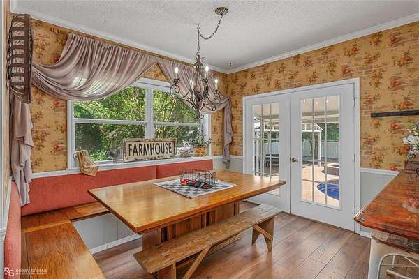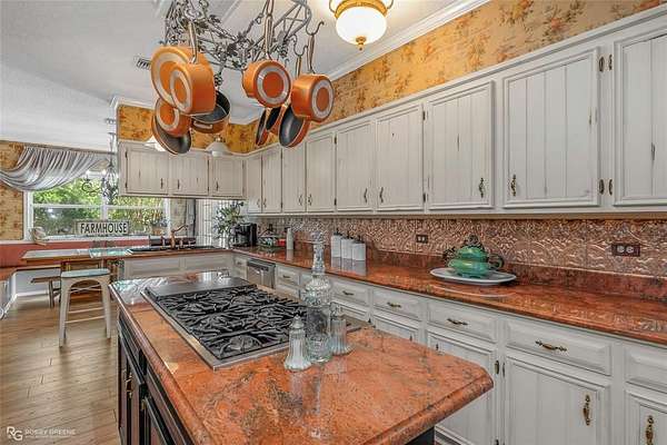 - Built-In Features, Cathedral Ceiling(s), Chandelier, Decorative Lighting, Eat-In Kitchen, Granite Counters, Kitchen Island, Natural Woodwork, Pantry, Second Primary Bedroom, Wainscoting, Walk-In Closet(s)