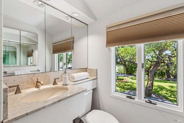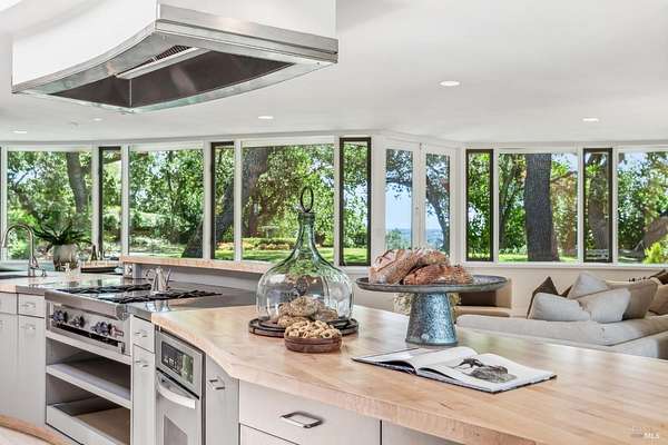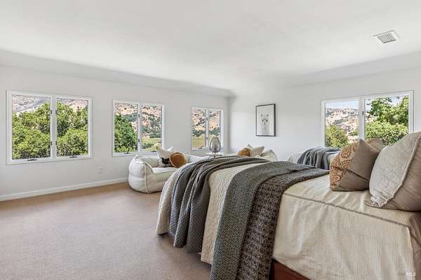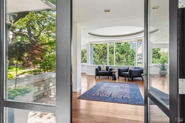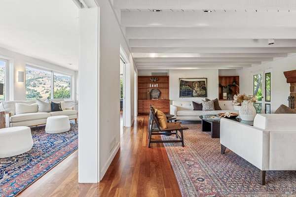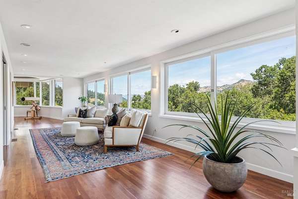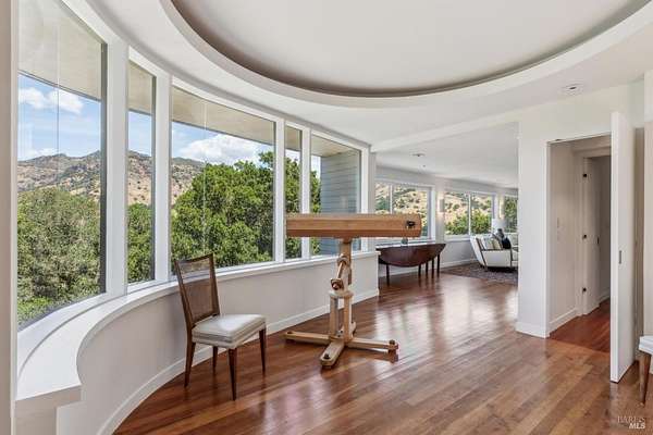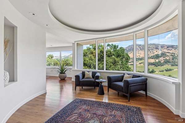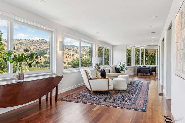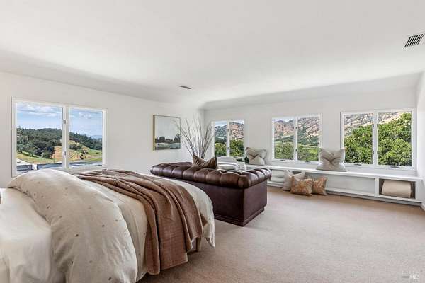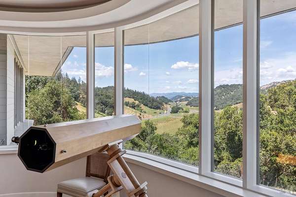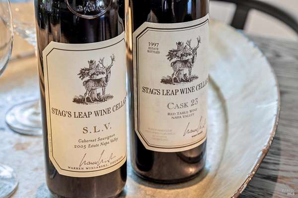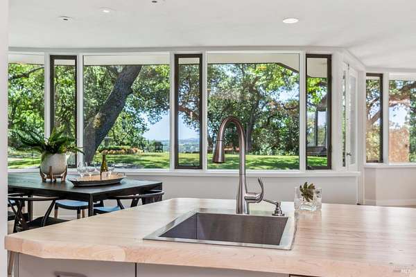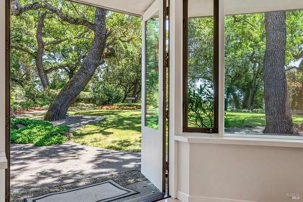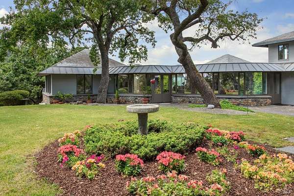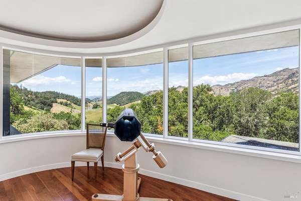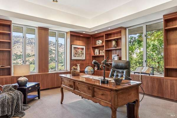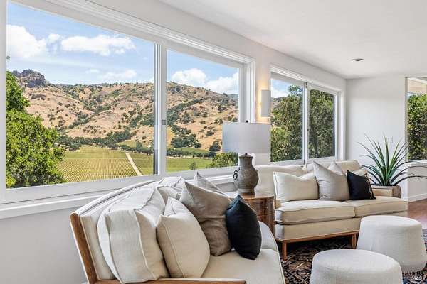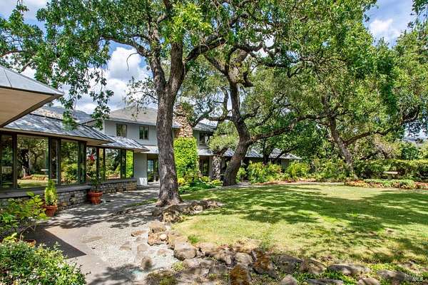 The incredible legacy of this estate will capture your imagination, while the beauty of the setting and the style and comfort of the home will capture your heart. Perched atop a knoll and anchored in bedrock, this 7,912 SF, 6-bedroom home commands views of Napa Valley with Stags Leap Palisades as the backdrop. Designed to take in the ever-changing light on the peaks, the home blends strength and artistry with restrained elegance. The glass-paneled doors open to amber wood floors and a gallery of windows. The warm bookshelf lined library is tucked down the hall, while the living room with open beams, stone fireplace, built-ins and hidden glass doors that partition it from the window gallery, then flows seamlessly to the bar & dining room with gorgeous views. The chef's kitchen features butcher block counters, a six-burner Wolf range, skylight, and is open to the family room. The west-facing primary suite offers a marble bath, deep soaking tub, and spacious dressing room. The lower level includes a former dance studio, additional bed & bath, woodworking shop, wine cellar, and guest suite with its own outside patio. Upstairs, three charming bedrooms feel like a secret retreat. Surrounded by gardens, and heritage oaks this 8.19 acres is history waiting to be loved and reimagined.
