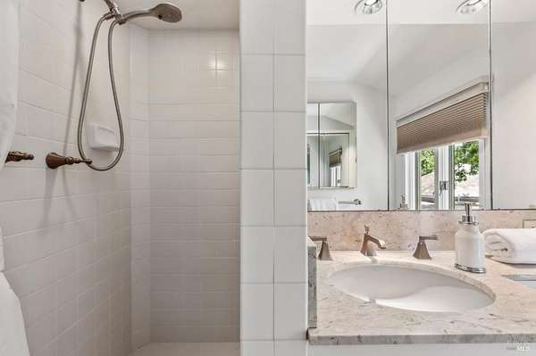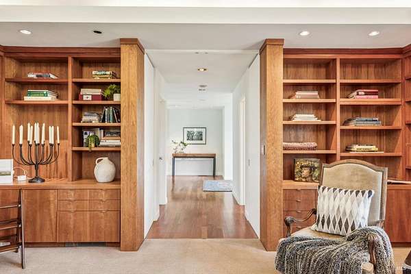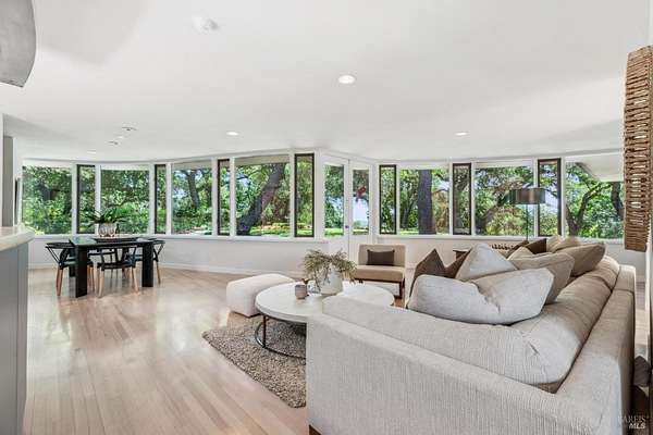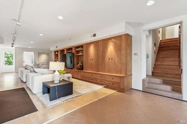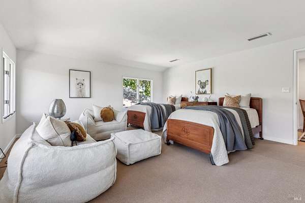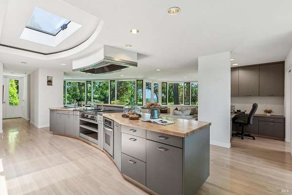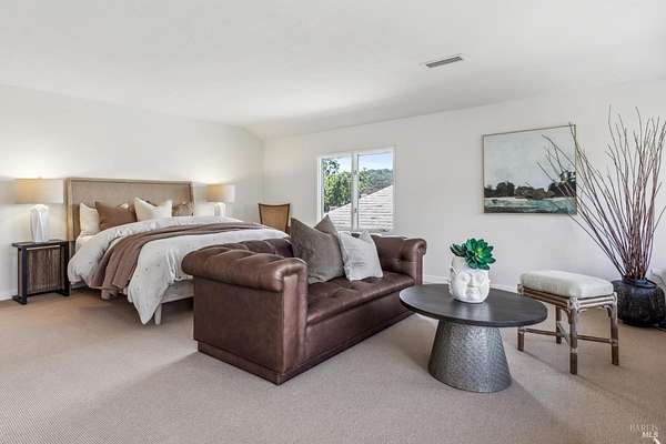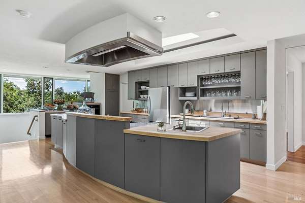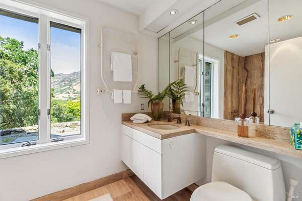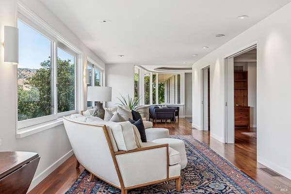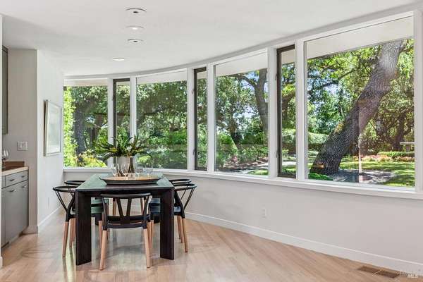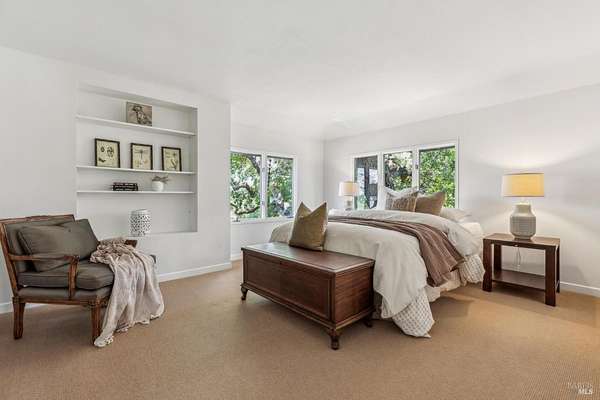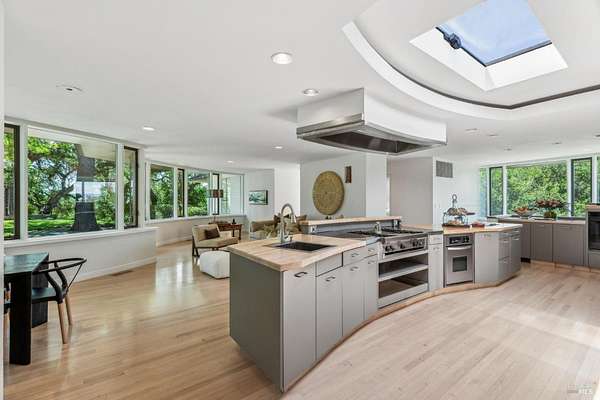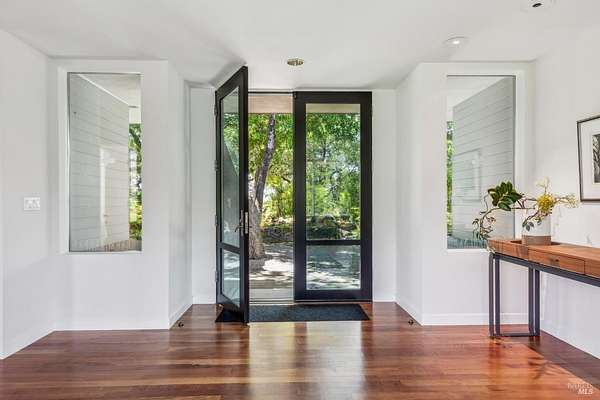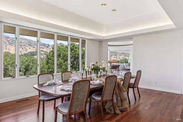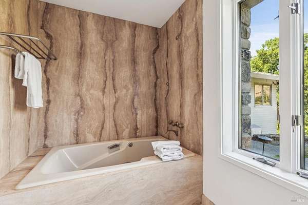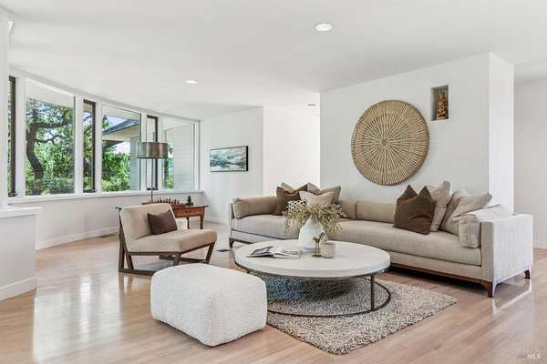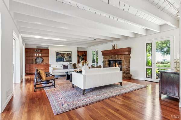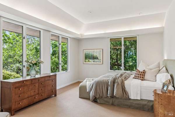 The incredible legacy of this estate will capture your imagination, while the beauty of the setting and the style and comfort of the home will capture your heart. Perched atop a knoll and anchored in bedrock, this 7,912 SF, 6-bedroom home commands views of Napa Valley with Stags Leap Palisades as the backdrop. Designed to take in the ever-changing light on the peaks, the home blends strength and artistry with restrained elegance. The glass-paneled doors open to amber wood floors and a gallery of windows. The warm bookshelf lined library is tucked down the hall, while the living room with open beams, stone fireplace, built-ins and hidden glass doors that partition it from the window gallery, then flows seamlessly to the bar & dining room with gorgeous views. The chef's kitchen features butcher block counters, a six-burner Wolf range, skylight, and is open to the family room. The west-facing primary suite offers a marble bath, deep soaking tub, and spacious dressing room. The lower level includes a former dance studio, additional bed & bath, woodworking shop, wine cellar, and guest suite with its own outside patio. Upstairs, three charming bedrooms feel like a secret retreat. Surrounded by gardens, and heritage oaks this 8.19 acres is history waiting to be loved and reimagined.